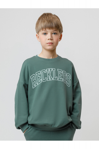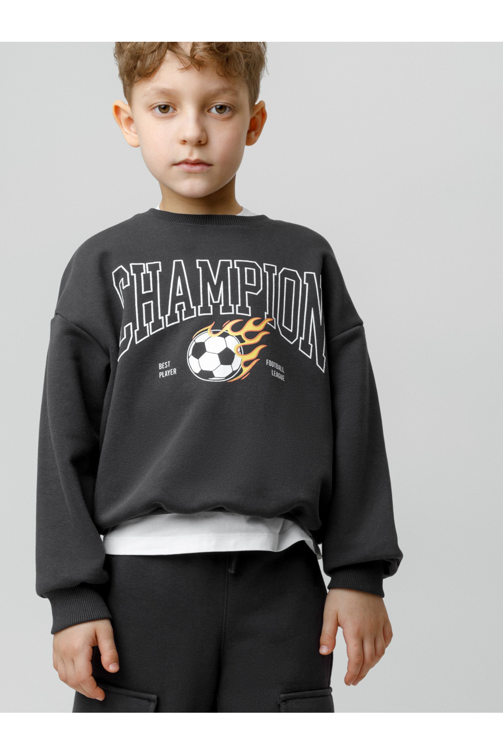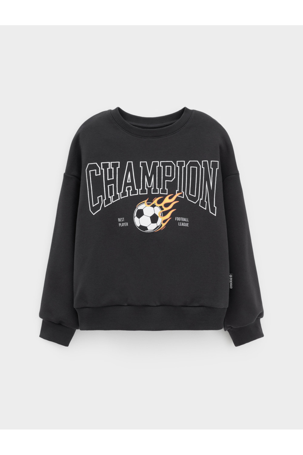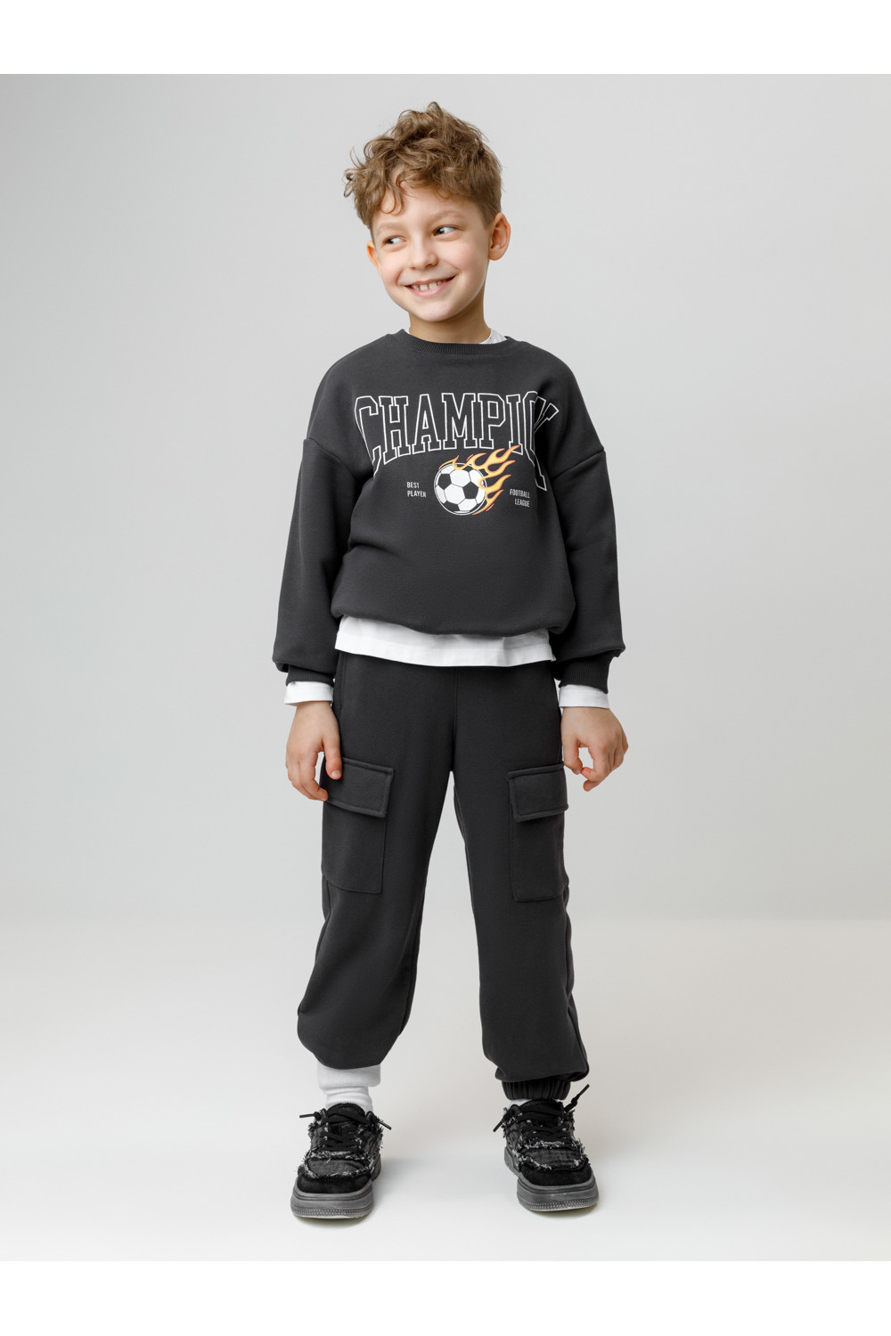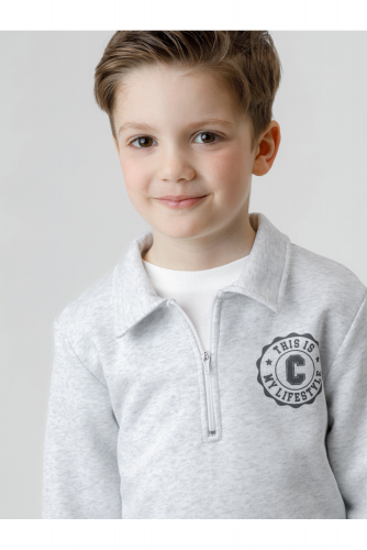 Свитшот для мальчика из высококачественного петельчатого футера. В составе 80% натурального хлопка и 20% полиэстера, при этом полиэстер ввязан внутрь по особой технологии и не соприкасается с кожей. Обтачка горловины, манжеты и пояс выполнены из эластичного полотна. Для удобства одевания имеется застёжка на кнопки в размерах 92 и 98. Оригинальный принт нанесён с помощью стойких текстильных гипоаллергенных красителей.
