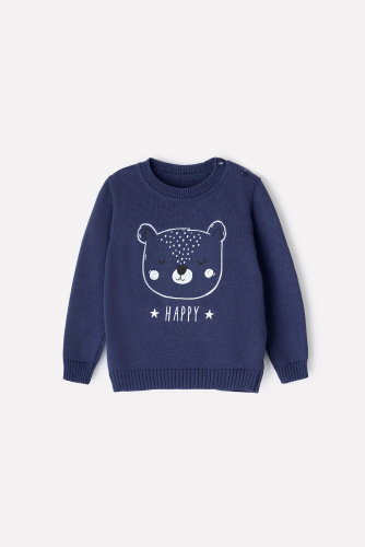 Вязаный джемпер с втачными рукавами. Украшен изображением енота. Связан из хлопковой пряжи. На рукавах эластичные манжеты. Внизу мягкий пояс. Застёгивается на пуговицу.