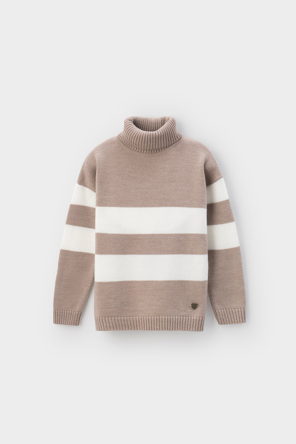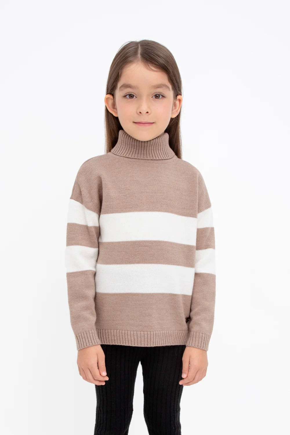 Вязаный джемпер для девочки из мягкой полушерстяной пряжи. Высокий воротник с отворотом хорошо защищает от холода. Длинные рукава с манжетами. Внизу эластичный пояс. Изделие сохраняет форму и стойкий цвет после многочисленных стирок.