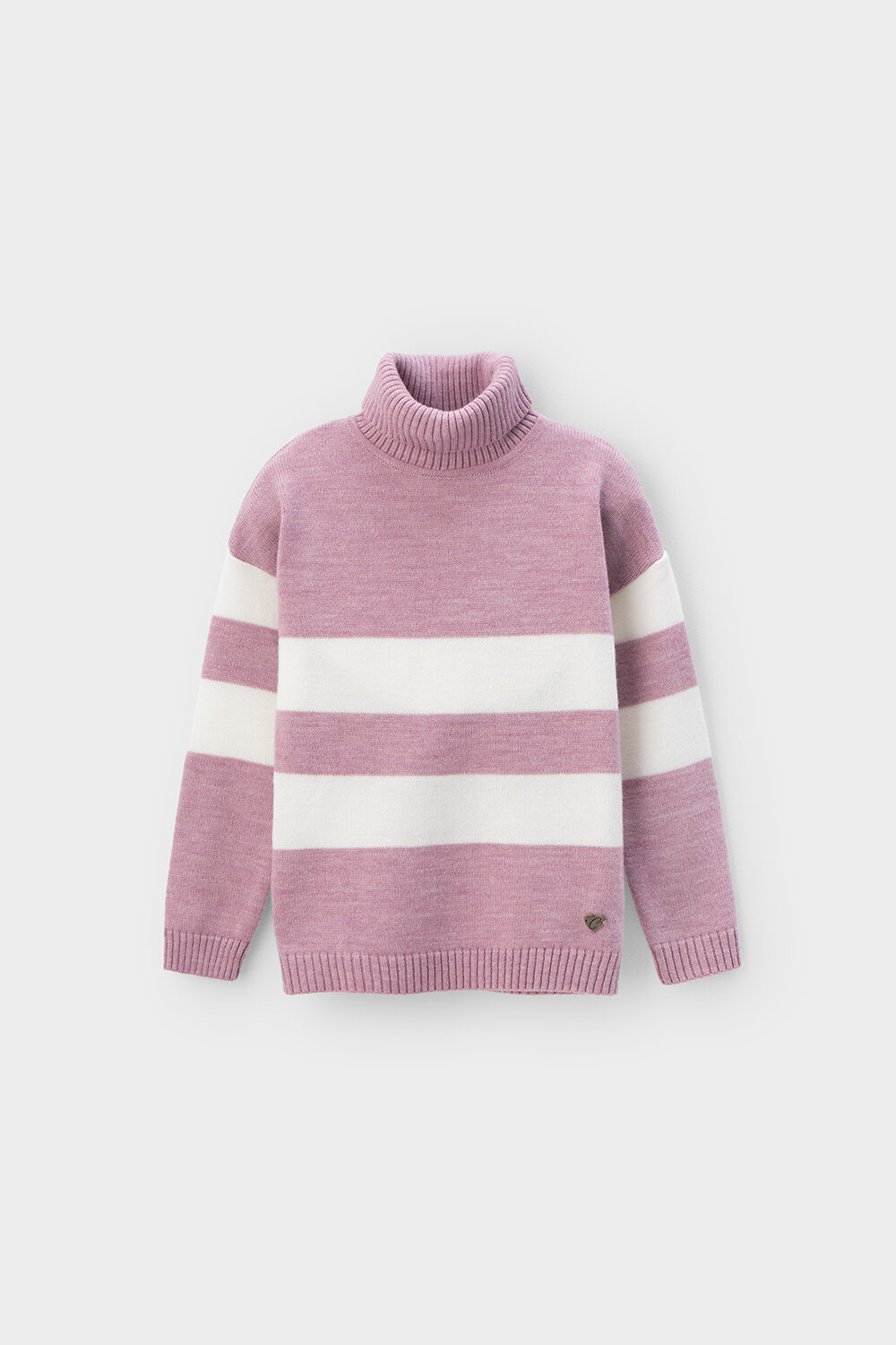 Вязаный джемпер для девочки из мягкой полушерстяной пряжи. Высокий воротник с отворотом хорошо защищает от холода. Длинные рукава с манжетами. Внизу эластичный пояс. Изделие сохраняет форму и стойкий цвет после многочисленных стирок.