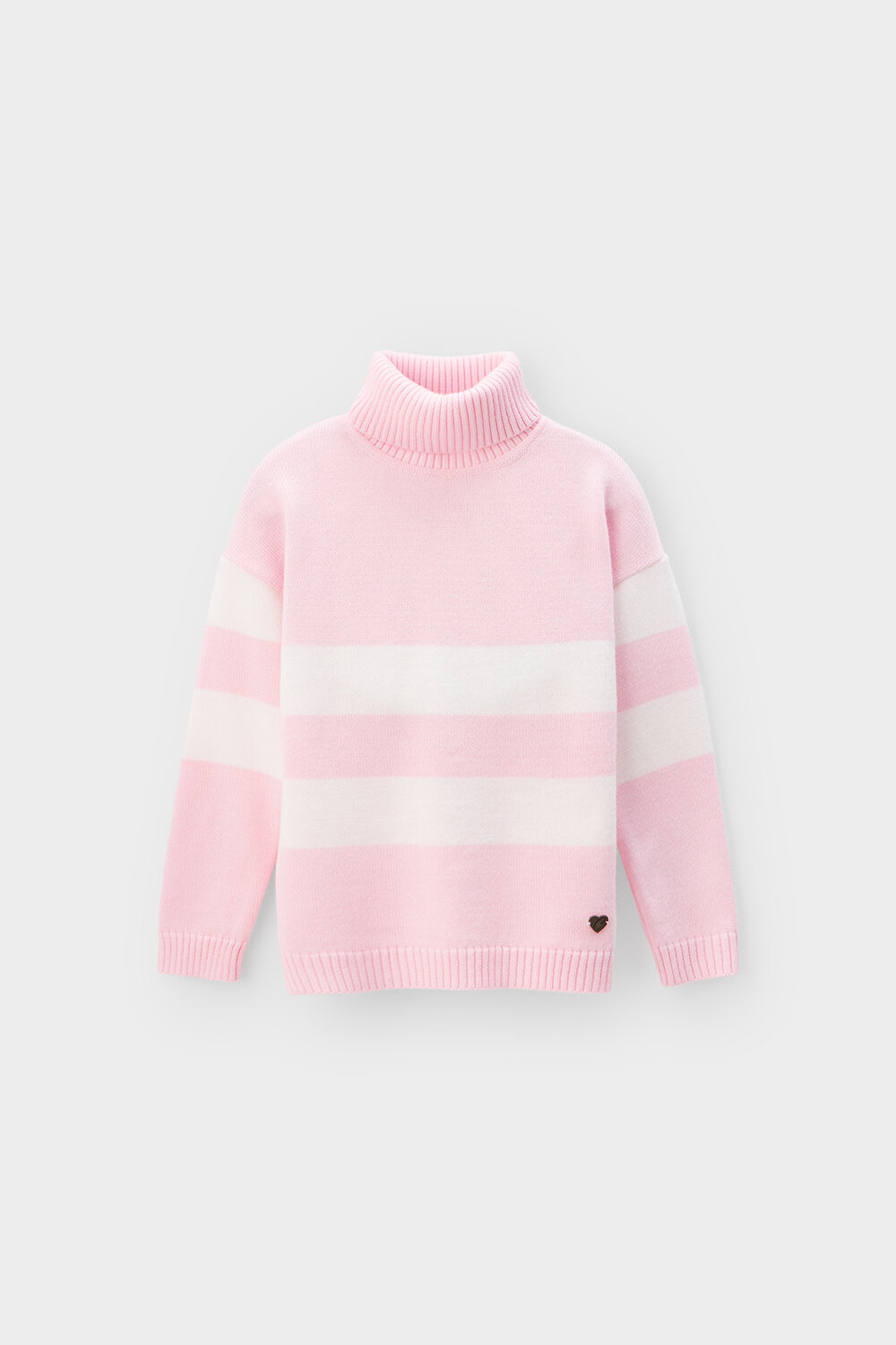 Вязаный джемпер для девочки из мягкой полушерстяной пряжи. Высокий воротник с отворотом хорошо защищает от холода. Длинные рукава с манжетами. Внизу эластичный пояс. Изделие сохраняет форму и стойкий цвет после многочисленных стирок.