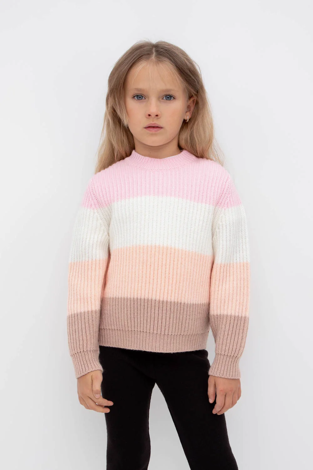 Вязаный джемпер для девочки из мягкой полушерстяной пряжи. Длинные рукава с манжетами. Внизу эластичный пояс. Для удобства изделие застёгивается на пуговицы на плече в размерах 92-104. Изделие сохраняет форму и стойкий цвет после многочисленных стирок.