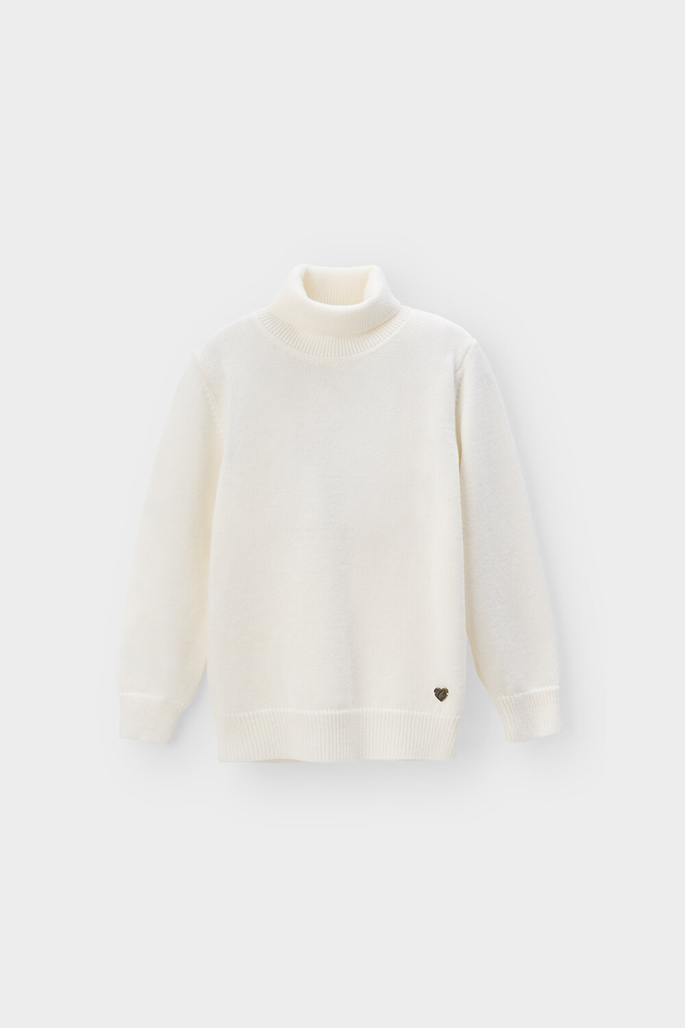 Вязаный джемпер для девочки из мягкой полушерстяной пряжи. Высокий воротник с отворотом хорошо защищает от холода. Изделие сохраняет форму и стойкий цвет после многочисленных стирок.