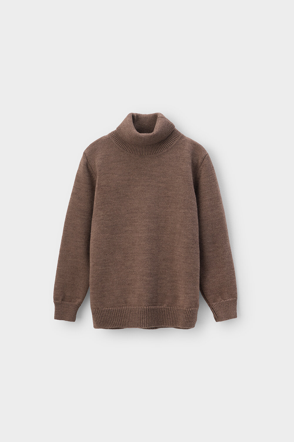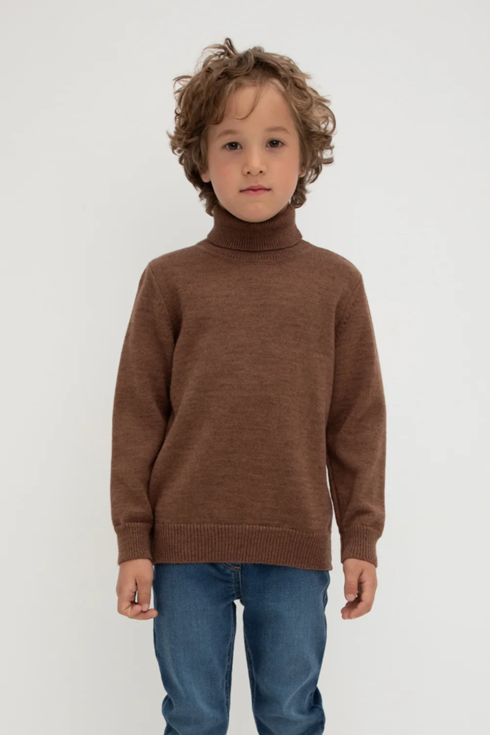 Вязаный джемпер для мальчика из мягкой полушерстяной пряжи. Высокий воротник с отворотом хорошо защищает от холода. Длинные рукава с манжетами. Внизу эластичный пояс. Изделие сохраняет форму и стойкий цвет после многочисленных стирок.