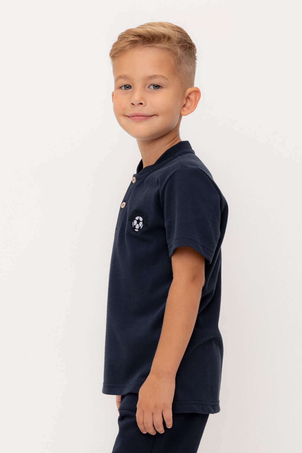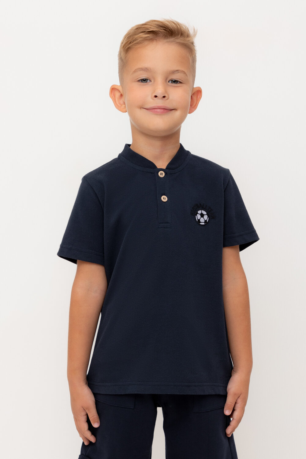 Поло с вышивкой для мальчика. Изготовлено из высококачественного трикотажного полотна пике. У изделия вязаный воротник и застежка спереди на две пуговицы.