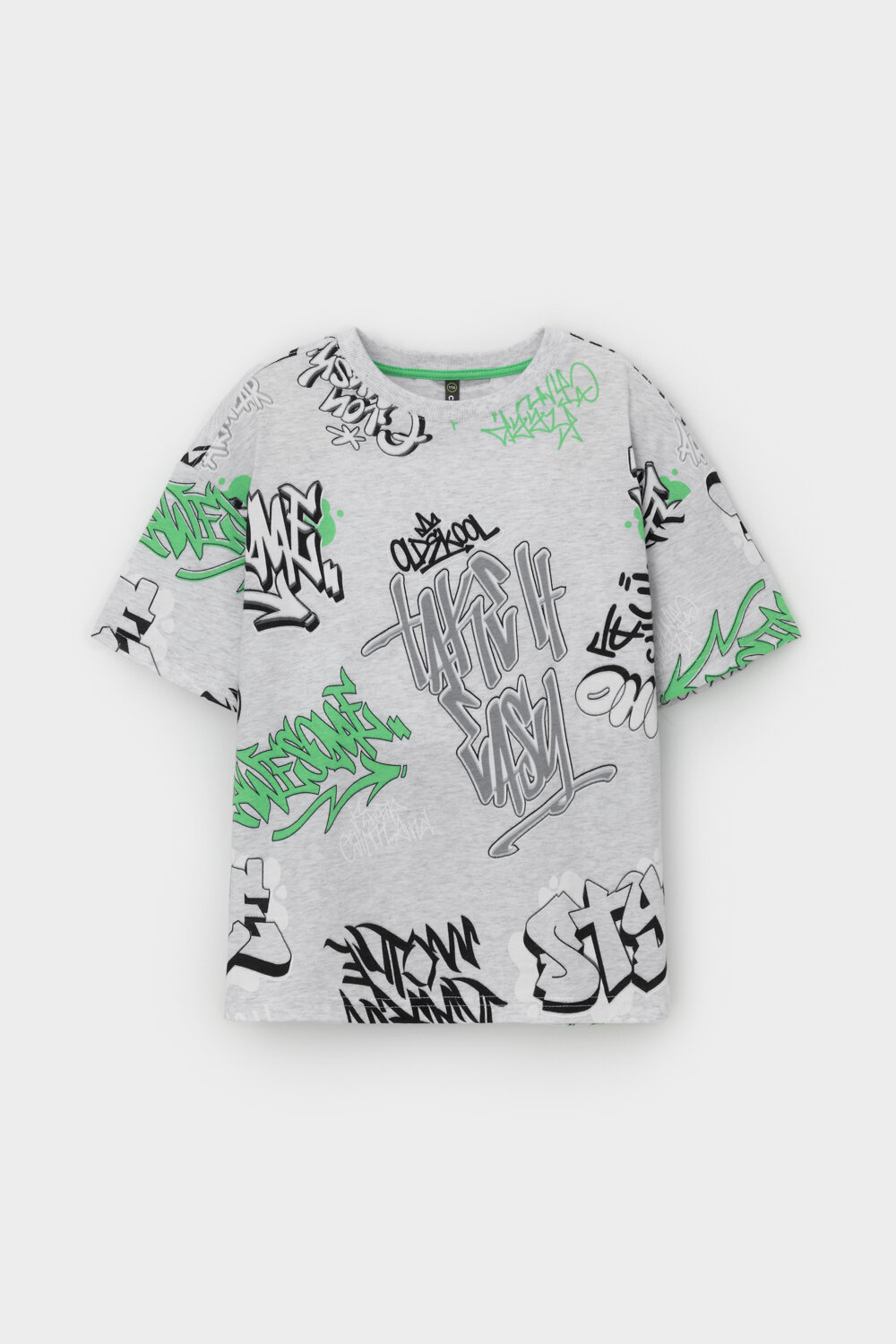 Футболка для мальчика из высококачественного трикотажного полотна. Оригинальный принт выполнен из стойких текстильных гипоаллергенных красителей. Для удобства в размерах 92 и 98 на спинке есть застежка на кнопки.