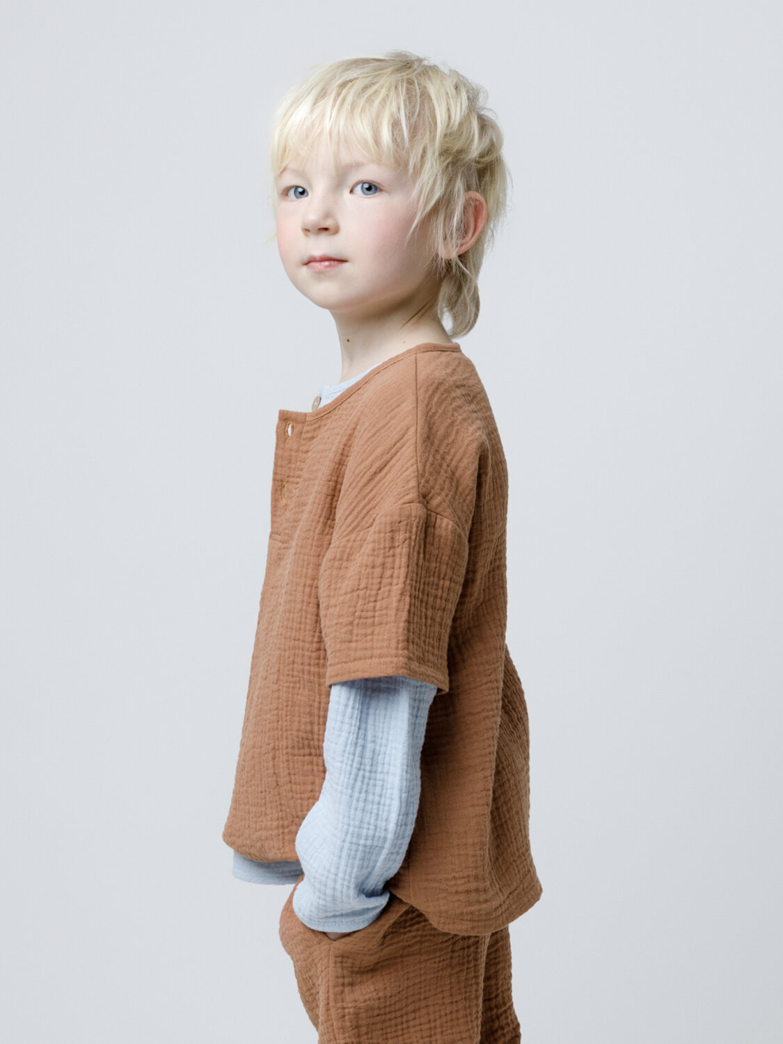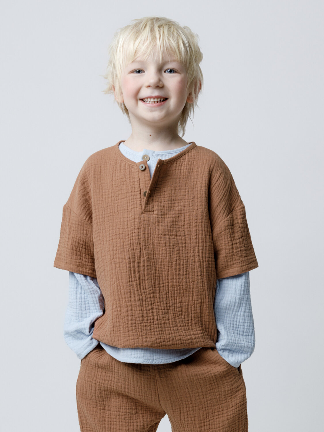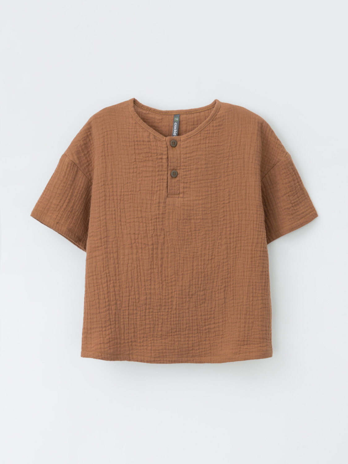 Легкая детская рубашка свободного кроя из мягкого хлопокового муслина, слегка спущенной линией плеча, длинными рукавами и с застежкой на пуговицы. Изделие сохраняет цвет, форму и фактуру жатости после многократных стирок.