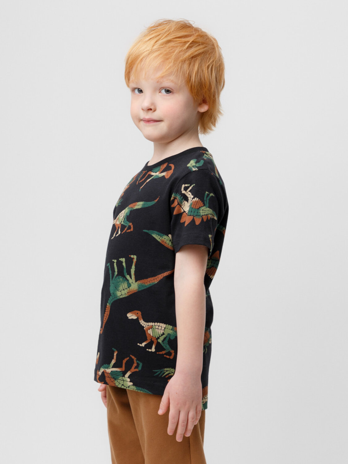 Трикотажная футболка для мальчика из натурального хлопка. У изделия короткие втачные рукава, удлинённая спинка и небольшие разрезы в боковых швах. Оригинальная набивка выполнена из стойких текстильных гипоаллергенных красителей. Футболка сохраняет цвет и форму после многократных стирок.