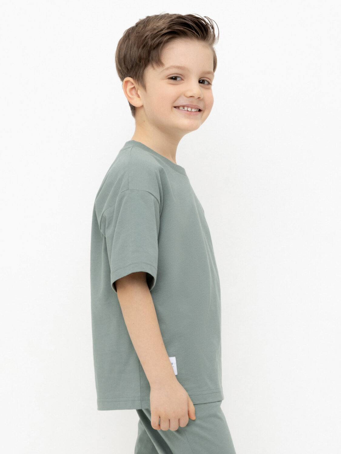 Однотонная футболка для мальчика из высококачественного трикотажного полотна. Для удобства одевания в размерах 92 и 98 застёгивается на спинке с помощью кнопок.