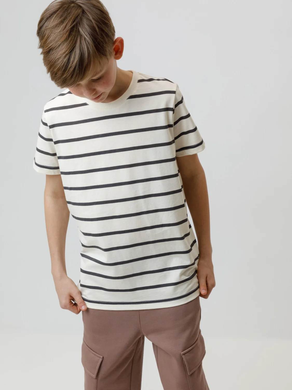 Футболка для мальчика из гладкого трикотажа, произведённого из высококачественного натурального хлопка. Изделие сохраняет цвет и форму после многократных стирок. Все трикотажные полотна производятся в соответствии с нормами швейцарского сертификата ЭкоТекс.