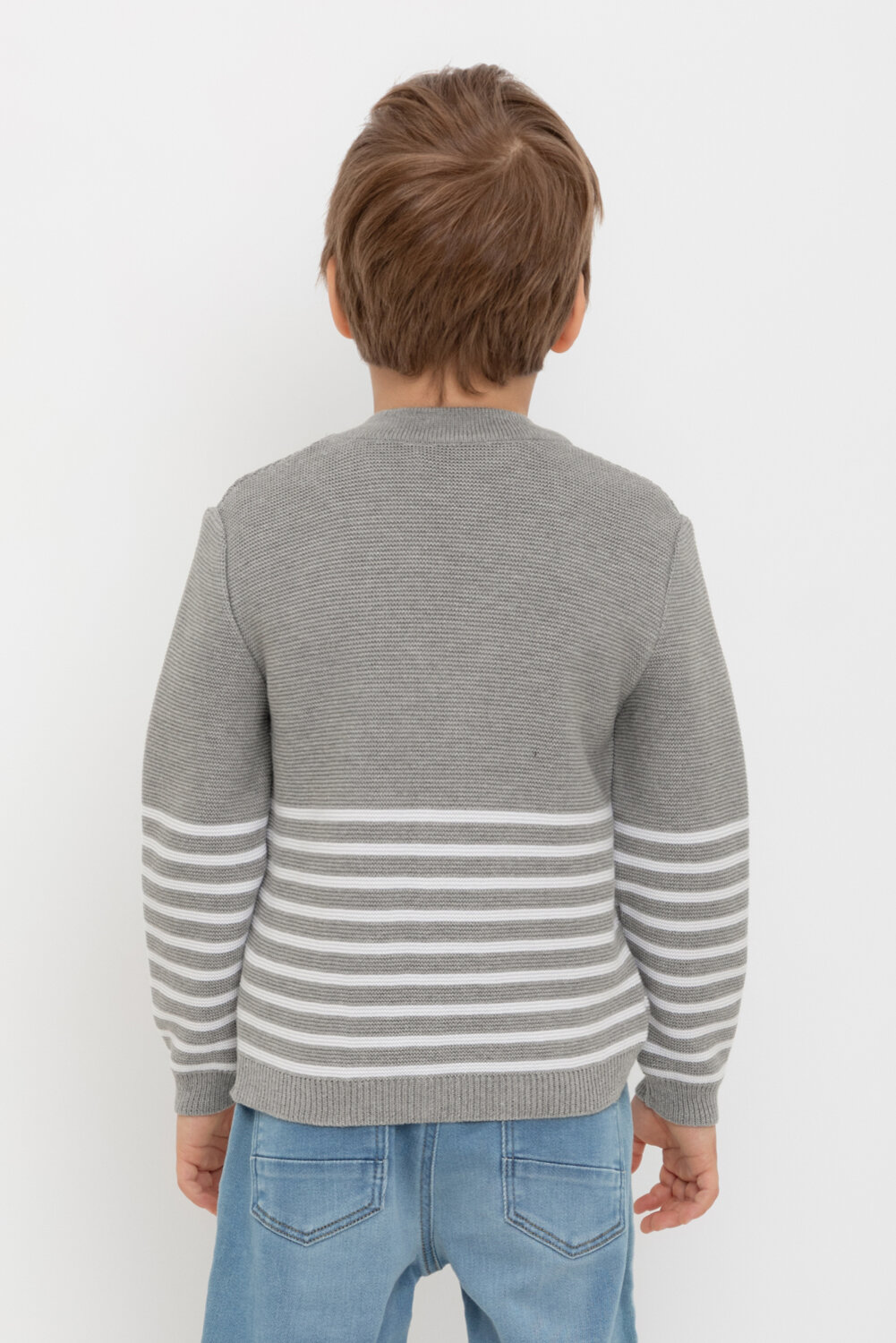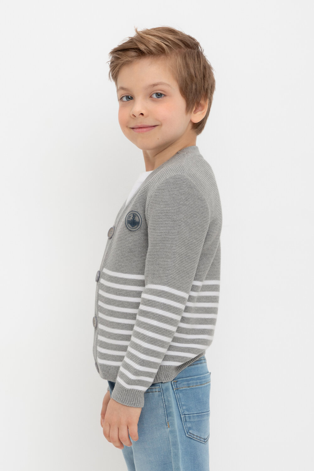Вязаный кардиган в полоску для мальчика с втачными рукавами. Связан из хлопковой пряжи. На рукавах эластичные манжеты. Внизу мягкий пояс. Застёгивается на пуговицы.