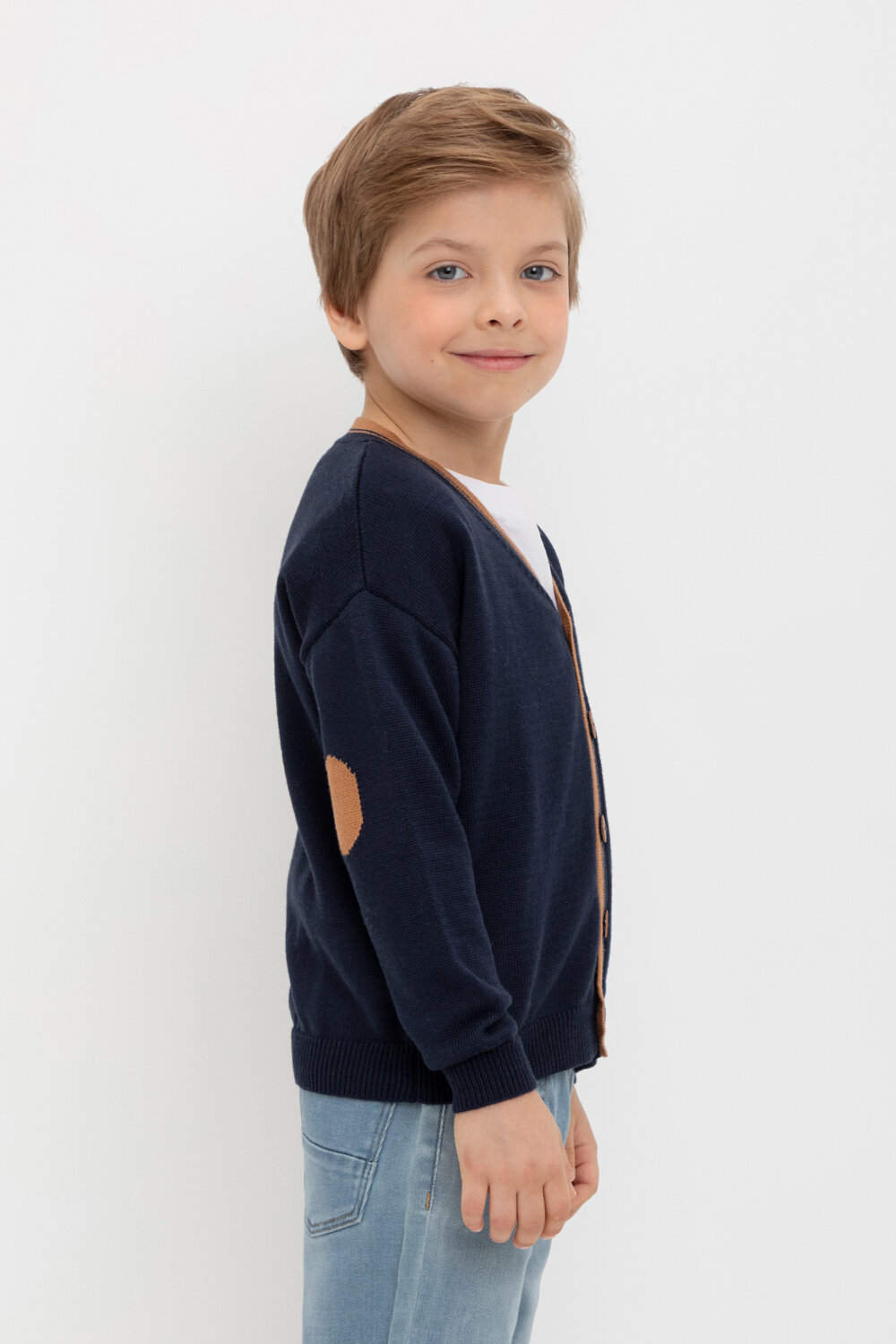 Вязаный кардиган для мальчика с втачными рукавами. Связан из хлопковой пряжи. На рукавах декоративные вывязанные заплатки и эластичные манжеты. Внизу мягкий пояс. Застёгивается на пуговицы.