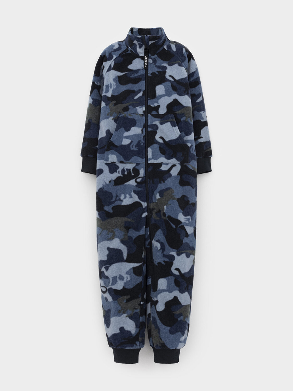 Флисовый комбинезон для мальчика с высоким воротником. Застёгивается на удлинённую молнию с мягкой защитой шеи и подбородка. Рукава и низ изделия на манжетах из трикотажа в рубчик. Эластичная резинка по спинке обеспечивает идеальную посадку. Спереди удобный карман-кенгуру. Оригинальная набивка выполнена из стойких гипоаллергенных текстильных красителей. Комбинезон сохраняет цвет и форму после многократных стирок.
