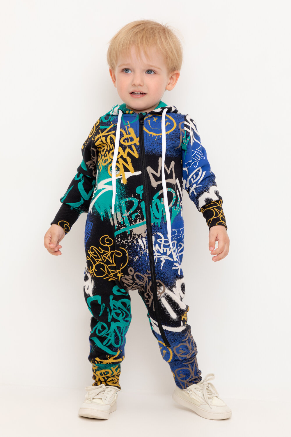 Комбинезон для мальчика из футера с начесом. Манжеты выполнены их эластичного трикотажа в рубчик. Застёжка на молнию с защитой шеи и подбородка. Оригинальная набивка выполнена из стойких текстильных гипоаллергенных красителей.