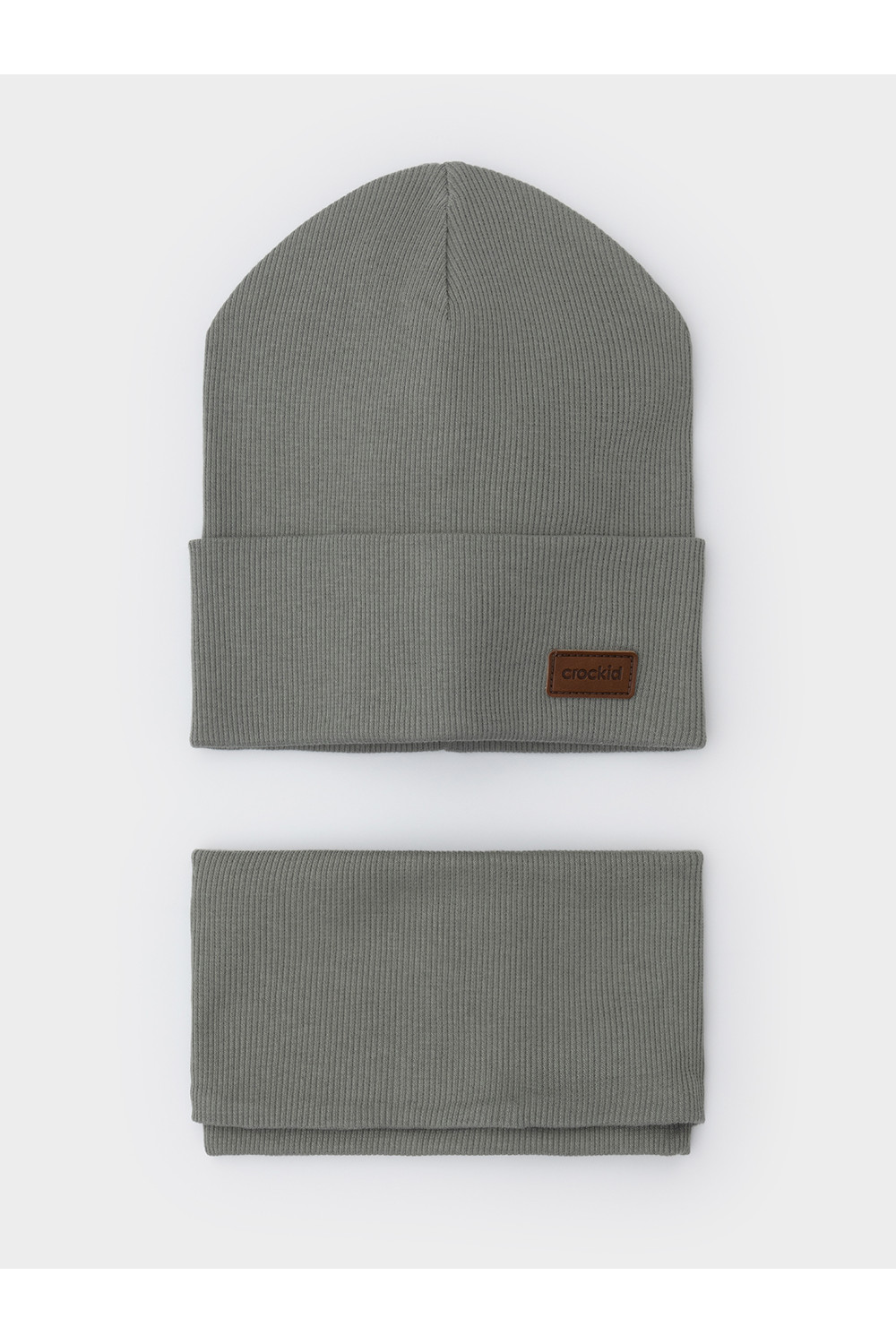 Комплект для мальчика: шапка и снуд из хлопкового трикотажа в рубчик с добавлением эластана, окрашенного стойкими гипоаллергенными текстильными красителями. Изделия хорошо тянутся, после многократных стирок сохраняют цвет и форму.