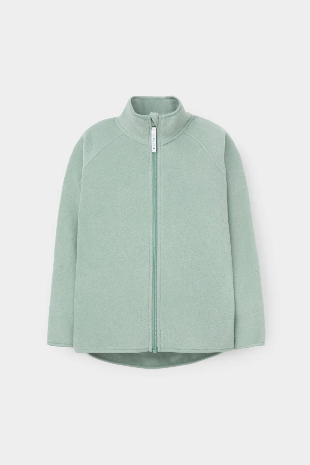 Флисовая куртка для девочки. У изделия удлинённая спинка, высокий воротник, предусмотрена защита шеи и подбородка. Рукава-реглан и низ изделия обработаны эластичным кантом для лучшего прилегания к телу, по бокам два кармана. Куртка сохраняет цвет и форму после многократных стирок.