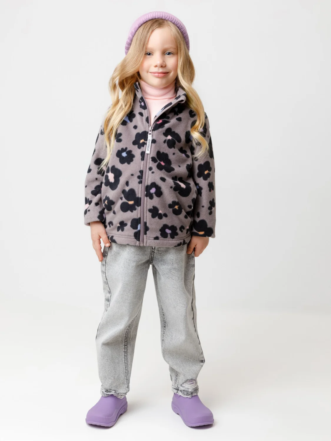 Флисовая куртка для девочки. У изделия высокий воротник и застёжка на молнию с мягкой защитой шеи и подбородка. По бокам два кармана. Оригинальная набивка выполнена из стойких гипоаллергенных текстильных красителей. Куртка сохраняет цвет и форму после многократных стирок.
