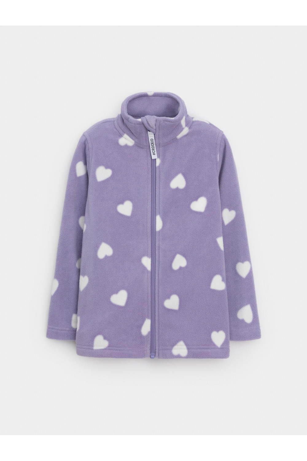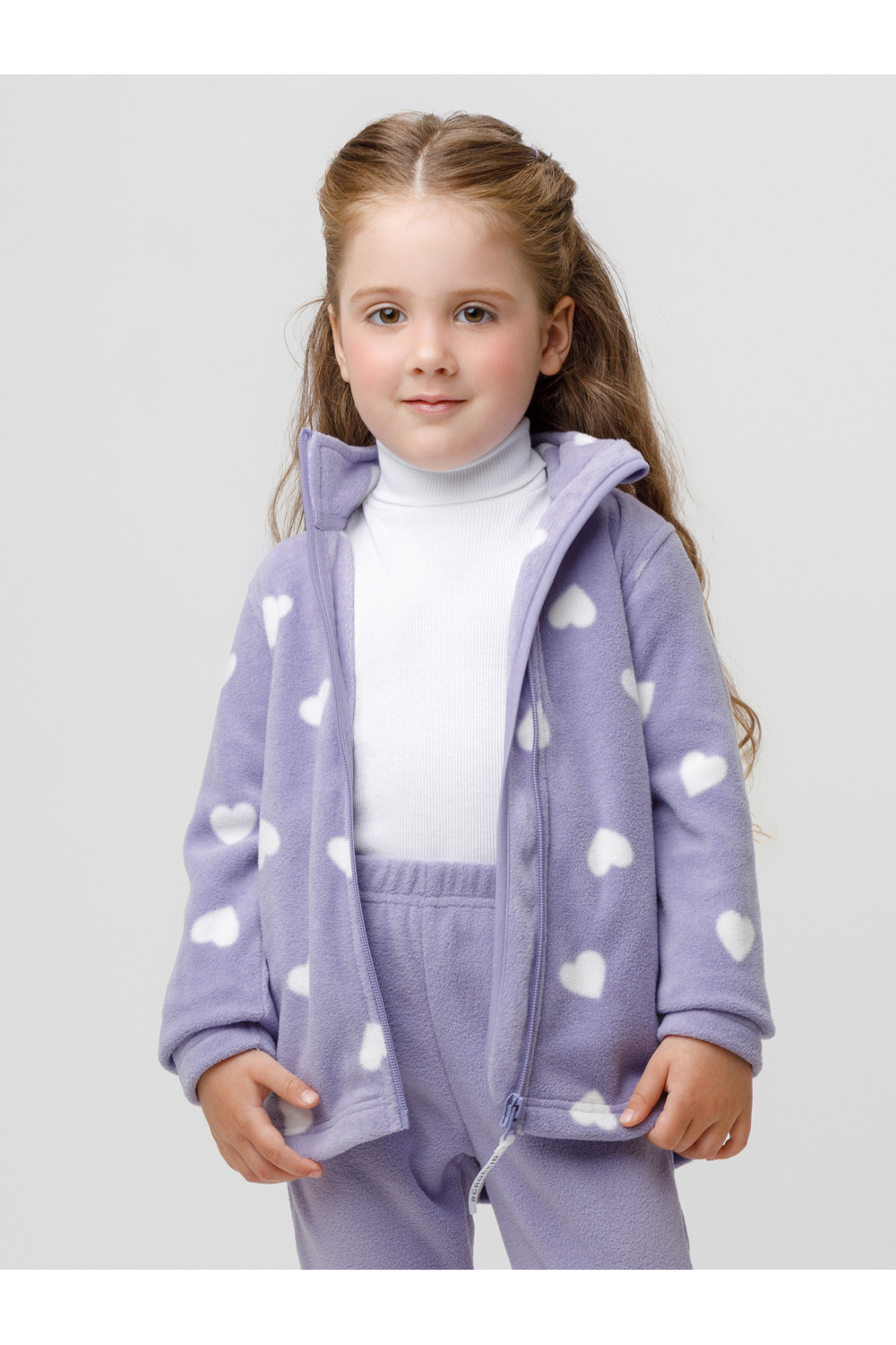 Флисовая куртка для девочки. У изделия высокий воротник и застёжка на молнию с мягкой защитой шеи и подбородка. По бокам два кармана. Оригинальная набивка выполнена из стойких гипоаллергенных текстильных красителей. Куртка сохраняет цвет и форму после многократных стирок.