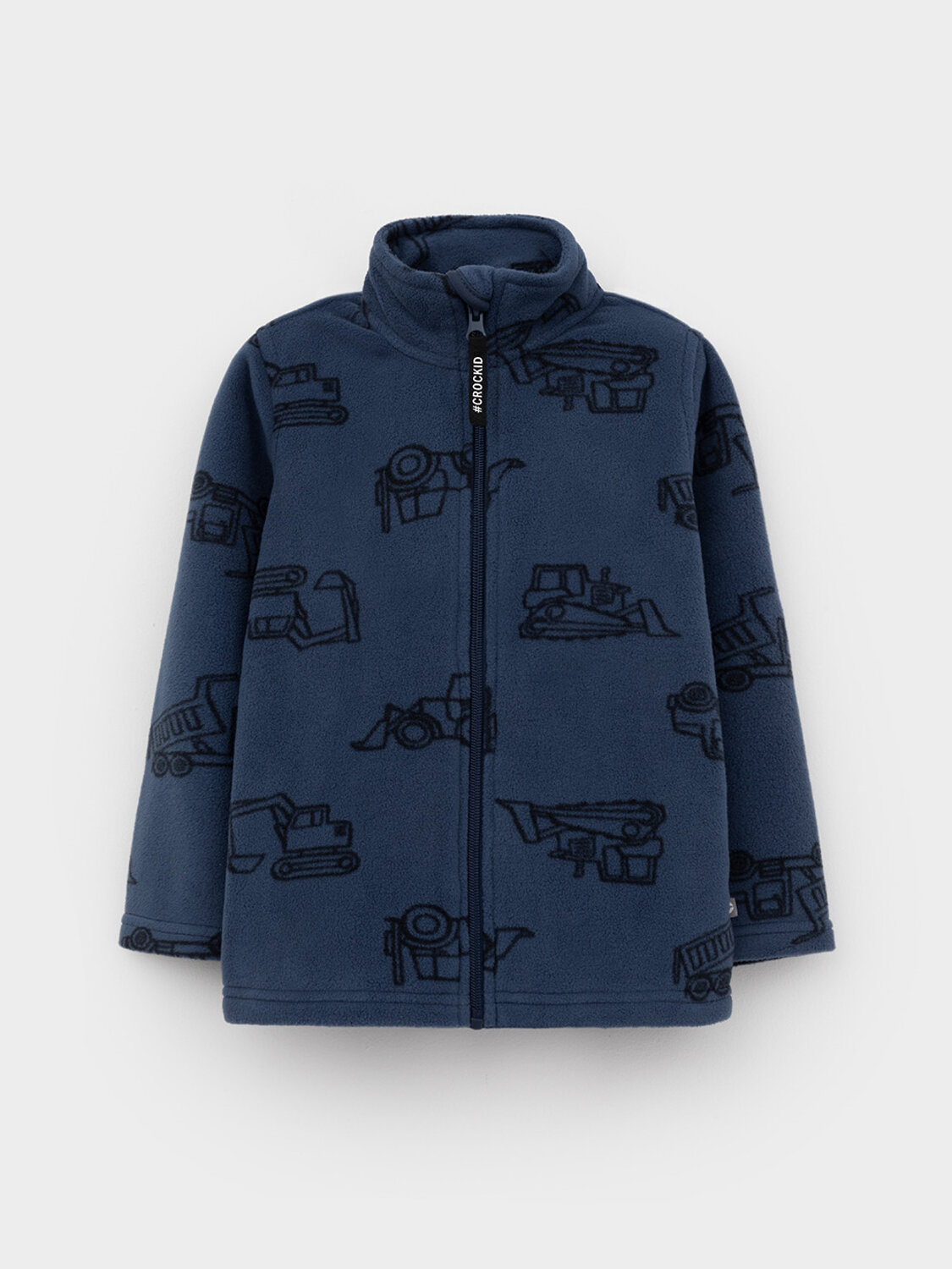 Флисовая куртка для мальчика. У изделия высокий воротник и застёжка на молнию с мягкой защитой шеи и подбородка. По бокам два кармана. Оригинальная набивка выполнена из стойких гипоаллергенных текстильных красителей. Куртка сохраняет цвет и форму после многократных стирок.