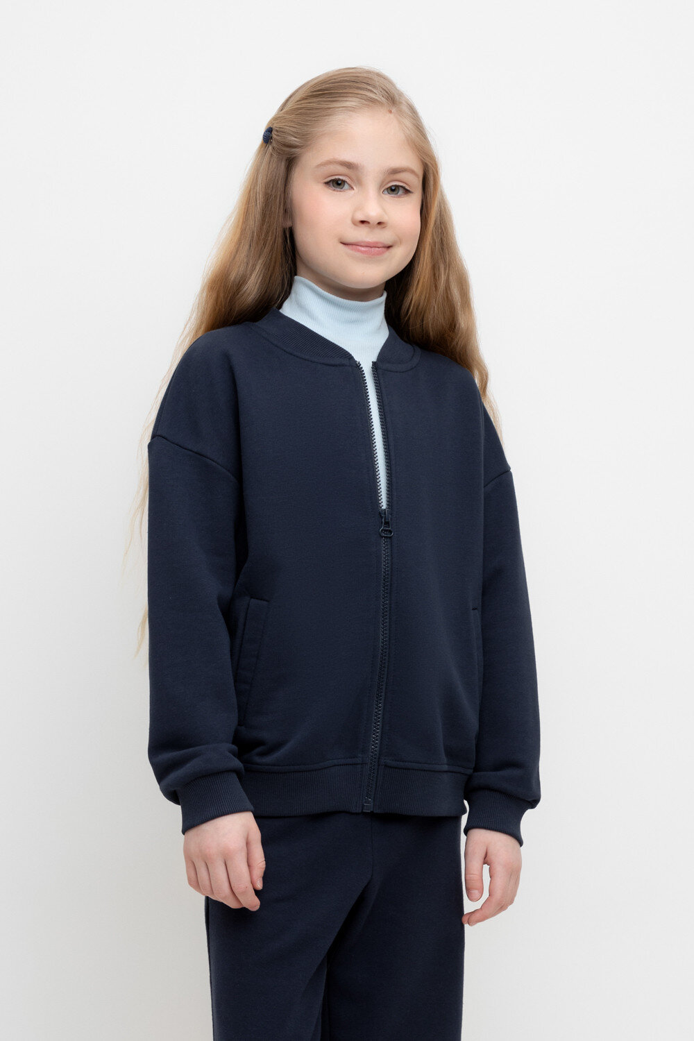 Трикотажная школьная куртка для девочки на молнии с карманами. Произведена из мягкого трикотажного футера трёхнитки. В составе 80% натурального хлопка и 20% полиэстера, при этом полиэстер ввязан внутрь по особой технологии и не соприкасается с кожей.