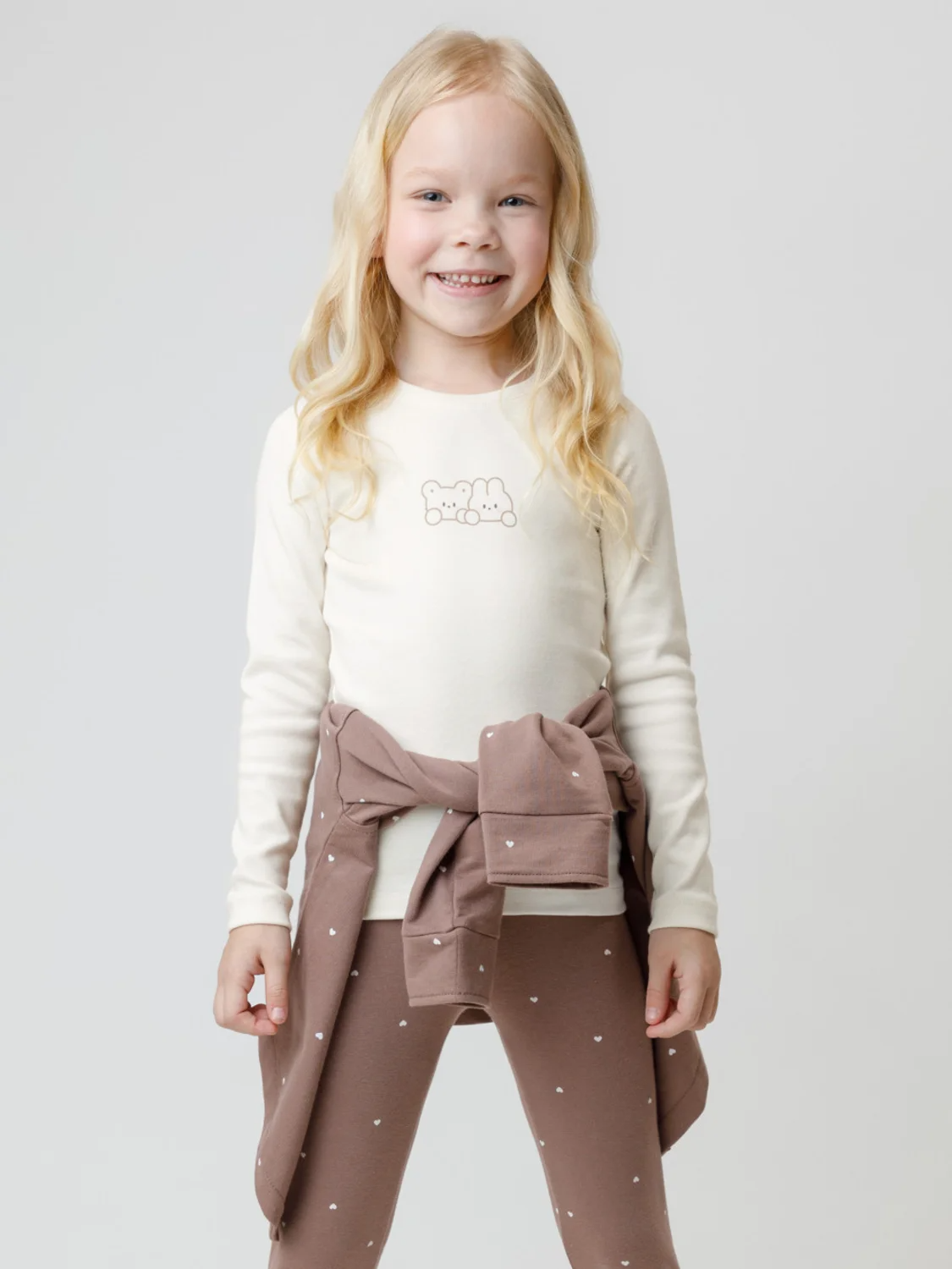 Тёплый лонгслив для девочки из мягкого трикотажа в рубчик с начёсом. Оригинальный принт выполнен из стойких текстильных гипоаллергенных красителей. Изделие сохраняет цвет и форму после многократных стирок. Все трикотажные полотна производятся в соответствии с нормами швейцарского сертификата ЭкоТекс.