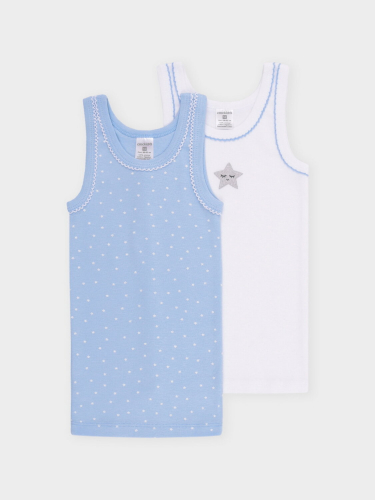 Трикотажные майки в комплекте 2 шт на лямках из натурального хлопка. Оригинальные набивка и принт выполнены из стойких, гипоаллергенных текстильных красителей. Изделие сохраняет цвет и форму после многократных стирок. Все трикотажные полотна производятся в соответствии с нормами Швейцарского сертификата ЭкоТекс.