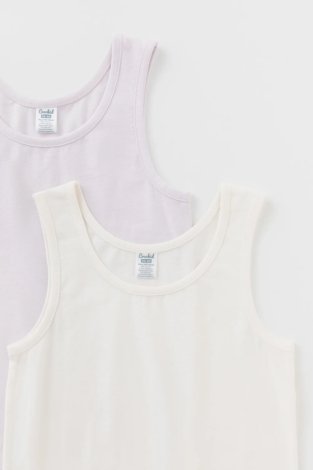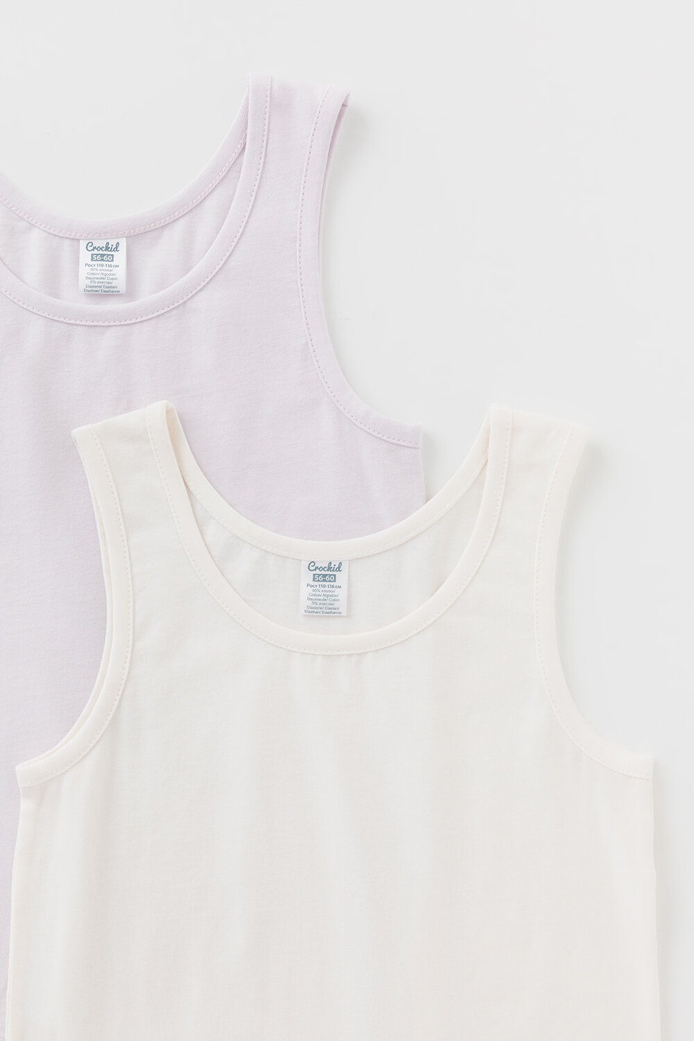 Трикотажные майки в комплекте 2 шт на тонких бретелях из однотонной рибаны, горловина и проймы обработаны кантом, по горловине полочки мережка и атласный бантик. Сохраняют цвет и форму после многократных стирок. Все трикотажные полотна производятся в соответсвии с нормами Швейцарского сертификата ЭкоТекс.