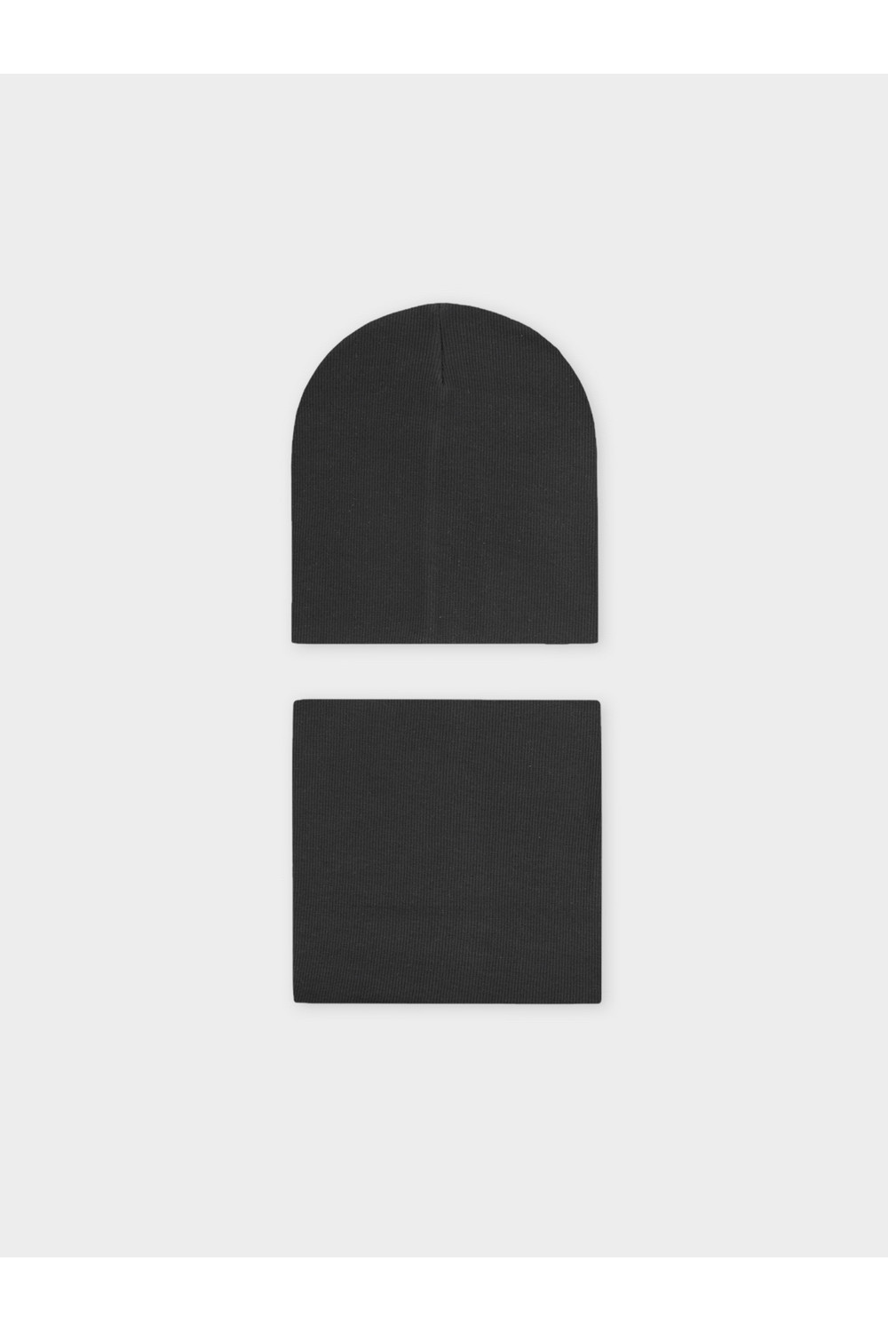 Комплект для мальчика: шапка и снуд из хлопкового трикотажа в рубчик с добавлением эластана, окрашенного стойкими гипоаллергенными текстильными красителями. Изделия хорошо тянутся, после многократных стирок сохраняют цвет и форму.