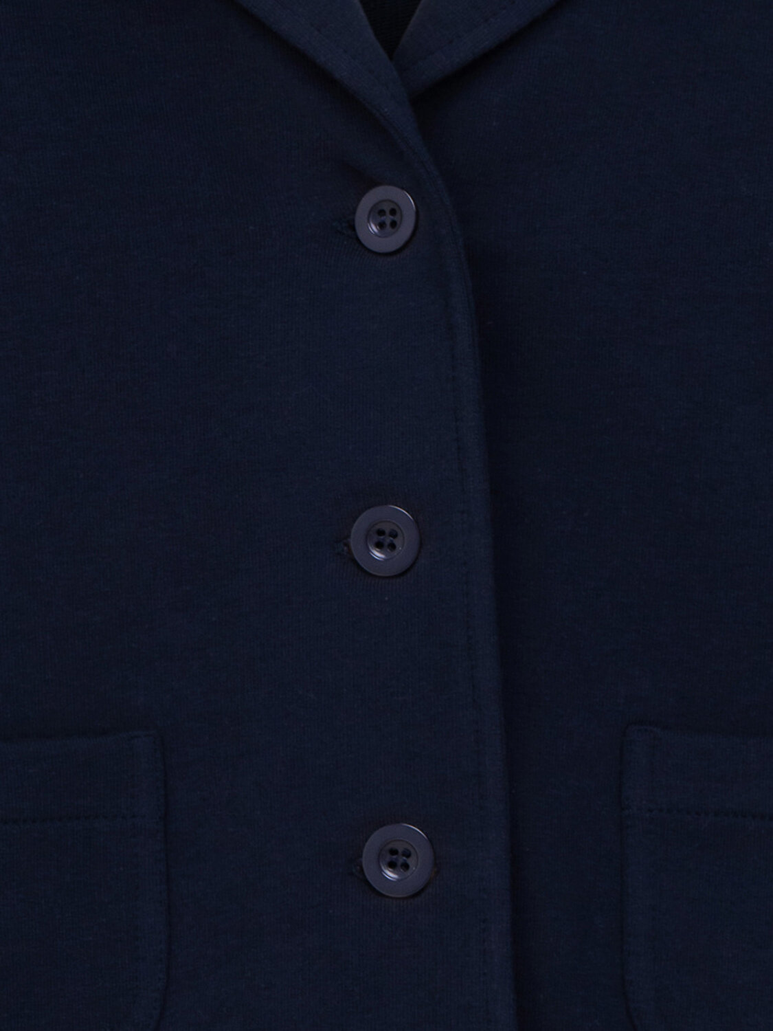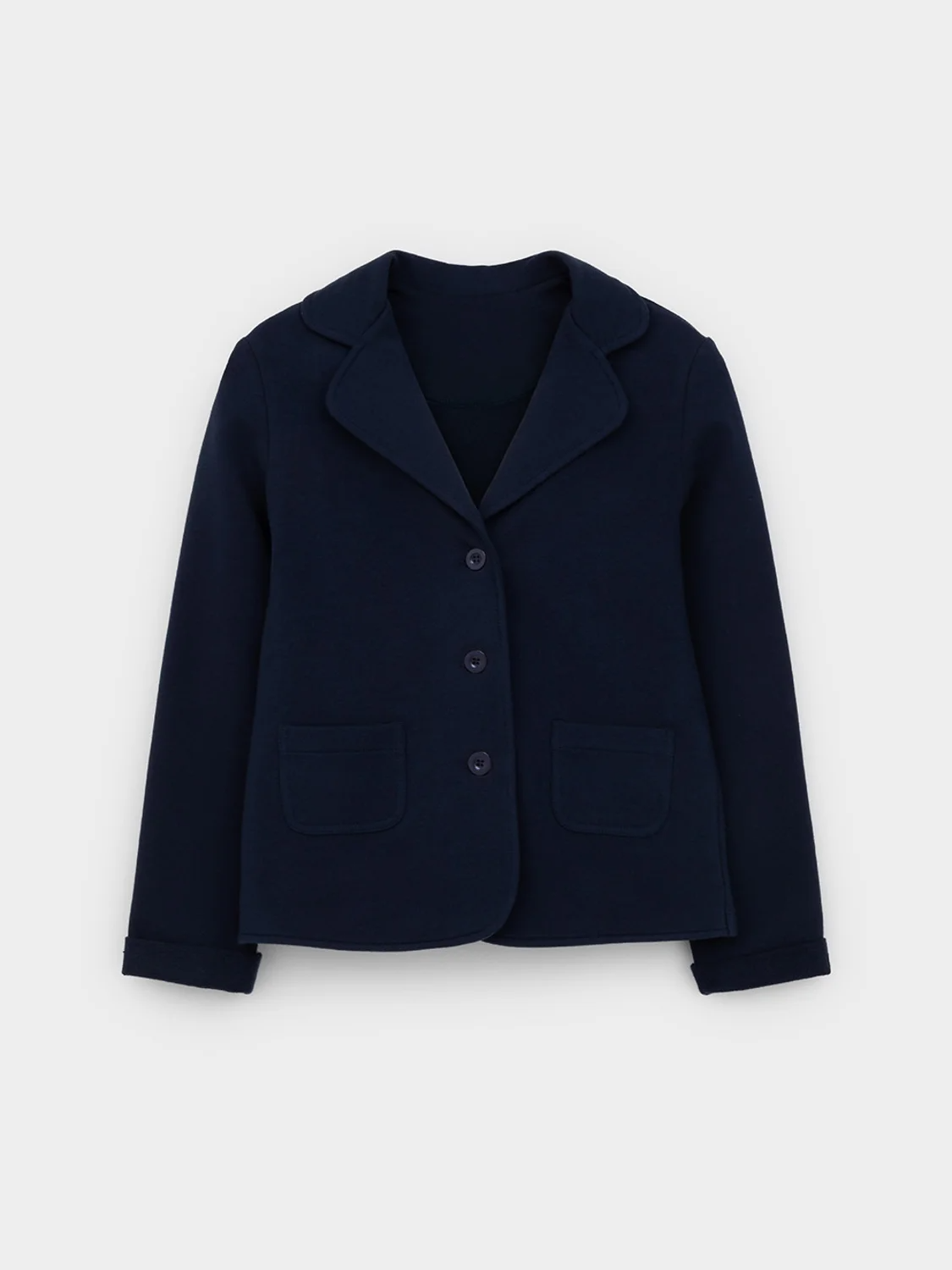 Пиджак школьный для девочки из петельчатого футера. Борта закруглены снизу. Впереди накладные карманы. Застёгивается на три пуговицы.