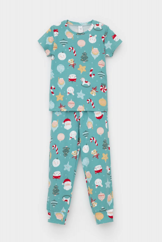 Пижама из хлопкового трикотажа интерлок. Однотонная футболка с короткими рукавами. Спереди принт. Штаны с набивным рисунком. Эластичные манжеты, цельнокроеный пояс, внутри плоская резинка.