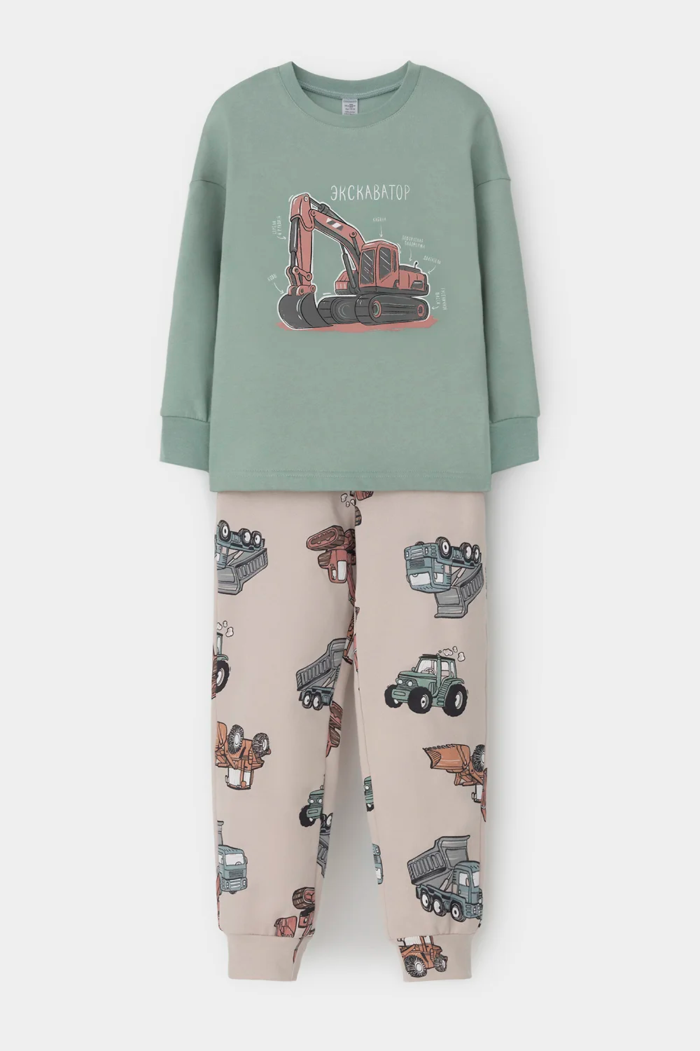 Трикотажная пижама с начёсом из натурального хлопка. Джемпер с длинными спущенными рукавами и брюки с эластичной резинкой в поясе. Мягкие манжеты на рукавах и по низу брюк. Оригинальные набивка и принт выполнены из стойких гипоаллергенных текстильных красителей. Изделие сохраняет цвет и форму после многократных стирок. Все трикотажные полотна производятся в соответсвии с нормами швейцарского сертификата ЭкоТекс.