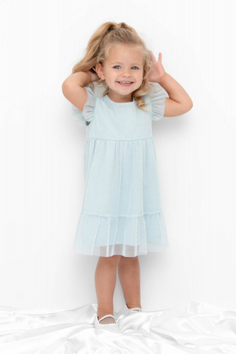 Нарядное платье для девочки из высококачественного трикотажа супрем с лёгким слоем из сетки с золотым переливом. Длинные рукава из сетки собраны на резинку. Для удобства одевания платье застёгивается на пуговицу на спинке. Платье сохраняет форму и стойкий цвет после многочисленных стирок и идеально подходит для праздников и фотосессий.