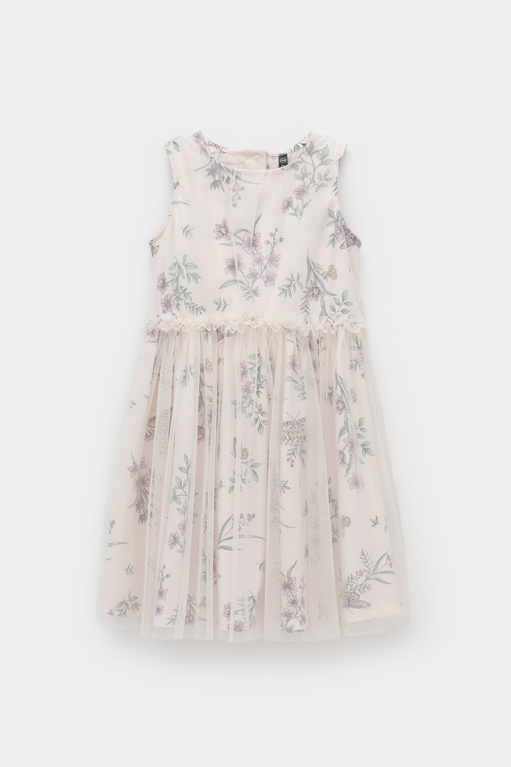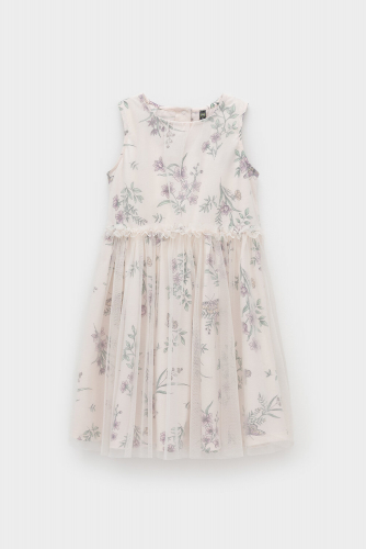 Легкое нарядное платье для девочки из высококачественного трикотажа, верхний слой - из сетки. Застёгивается на спинке с помощью кнопок. Оригинальная набивка выполнена из стойких текстильных гипоаллергенных красителей. Изделие сохраняет цвет и форму после многократных стирок.