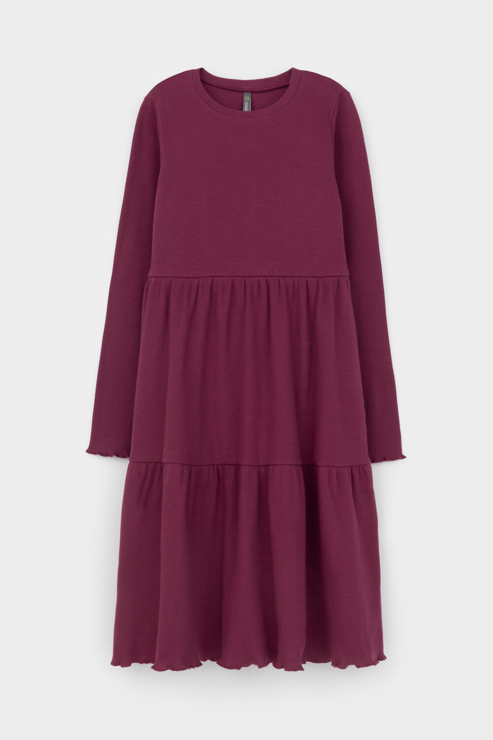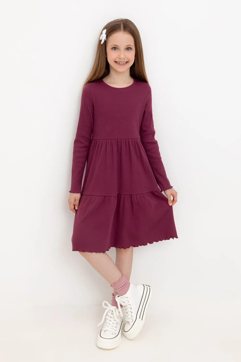 Платье с длинными рукавами и оборками для девочки из эластичного трикотажа в рубчик.