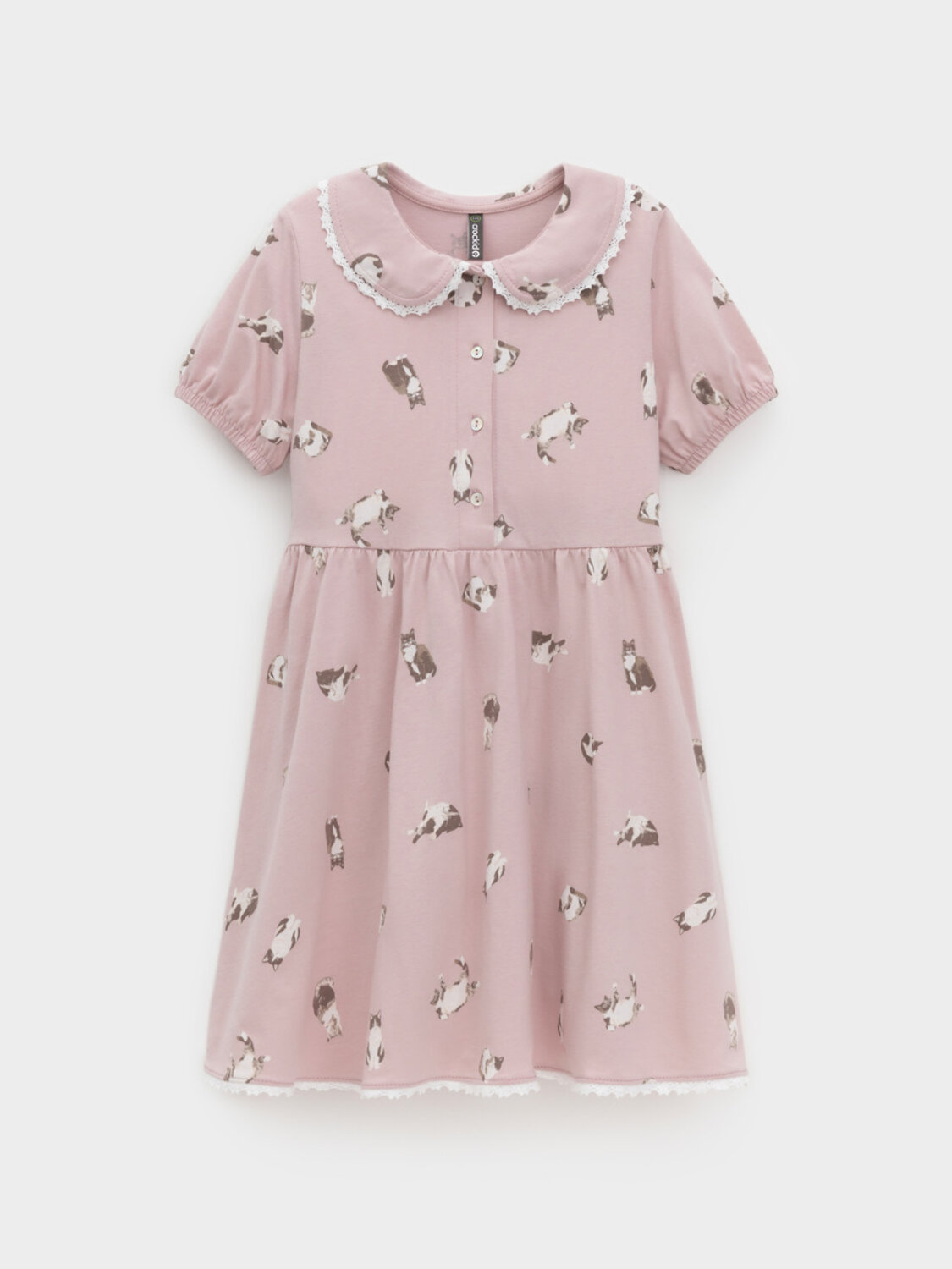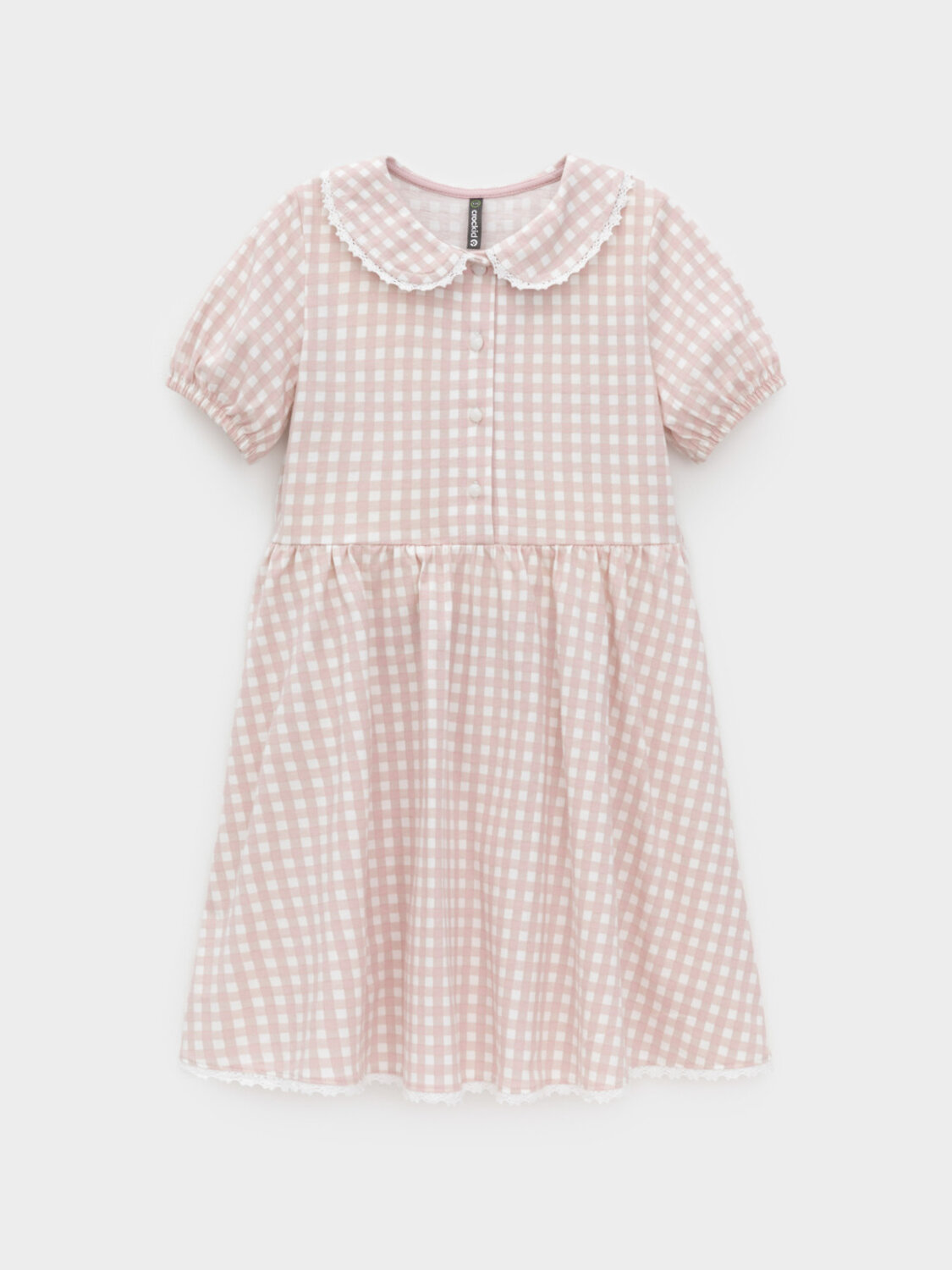 Платье для девочки с короткими рукавами из высококачественного гладкого трикотажа. Для удобства одевания платье застёгивается на пуговицы спереди. Украшено кружевом. Платье сохраняет форму и стойкий цвет после многочисленных стирок и идеально подходит на каждый день. Все трикотажные полотна производятся в соответствии с нормами швейцарского сертификата ЭкоТекс.