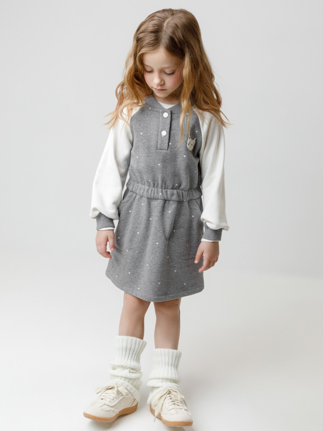 Платье с поясом на резинке для девочки. Изготовлено из мягкого петельчатого трикотажа. В составе 80% натурального хлопка и 20% полиэстера, при этом полиэстер ввязан внутрь по особой технологии и не соприкасается с кожей. Застёгивается спереди на кнопки. Оригинальный рисунок выполнен из стойких текстильных гипоаллергенных красителей. Изделие сохраняет цвет и форму после многократных стирок. Все трикотажные полотна производятся в соответствии с нормами швейцарского сертификата ЭкоТекс.