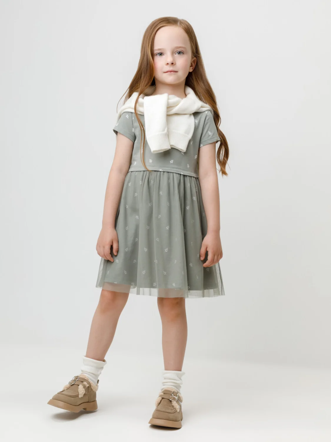 Нарядное платье для девочки с воздушным верхним слоем из сетки. Изготовлено из высококачественного гладкого трикотажа, произведённого из натурального хлопка. Застёгивается на кнопки в размерах 92 и 98. Оригинальный рисунок выполнен из стойких текстильных гипоаллергенных красителей. Изделие сохраняет цвет и форму после многократных стирок. Все трикотажные полотна производятся в соответствии с нормами швейцарского сертификата ЭкоТекс.