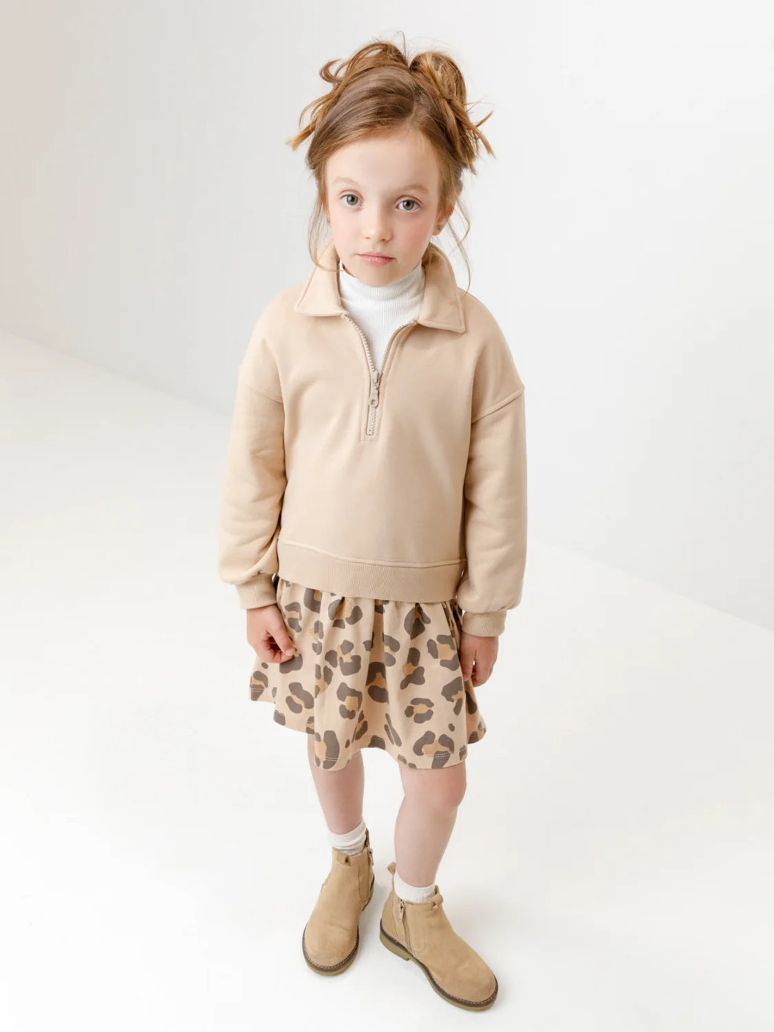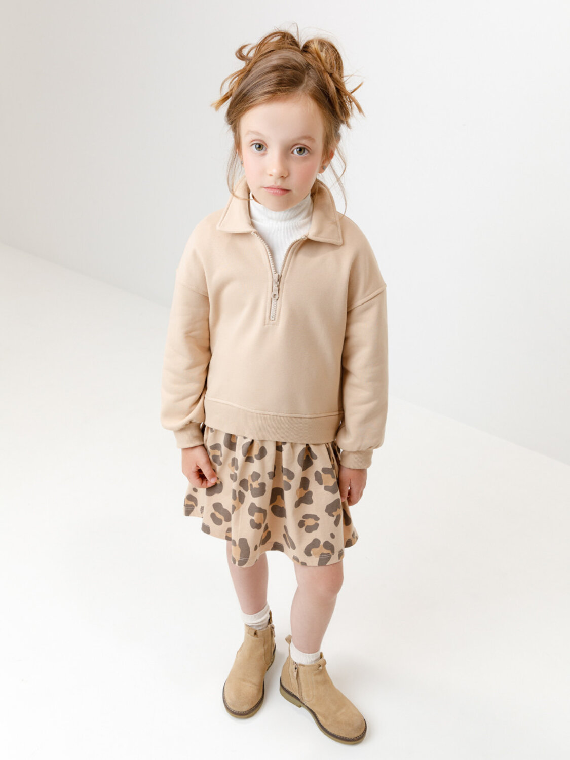 Платье для девочки с длинными рукавами и воротничком. Изготовлено из мягкого петельчатого трикотажа и украшено оборкой из гладкого материала супрем. Спереди застёжка на короткую молнию. Платье сохраняет форму и стойкий цвет после многочисленных стирок и идеально подходит на каждый день. Оригинальный принт выполнен из стойких текстильных гипоаллергенных красителей. Все трикотажные полотна производятся в соответствии с нормами швейцарского сертификата ЭкоТекс.