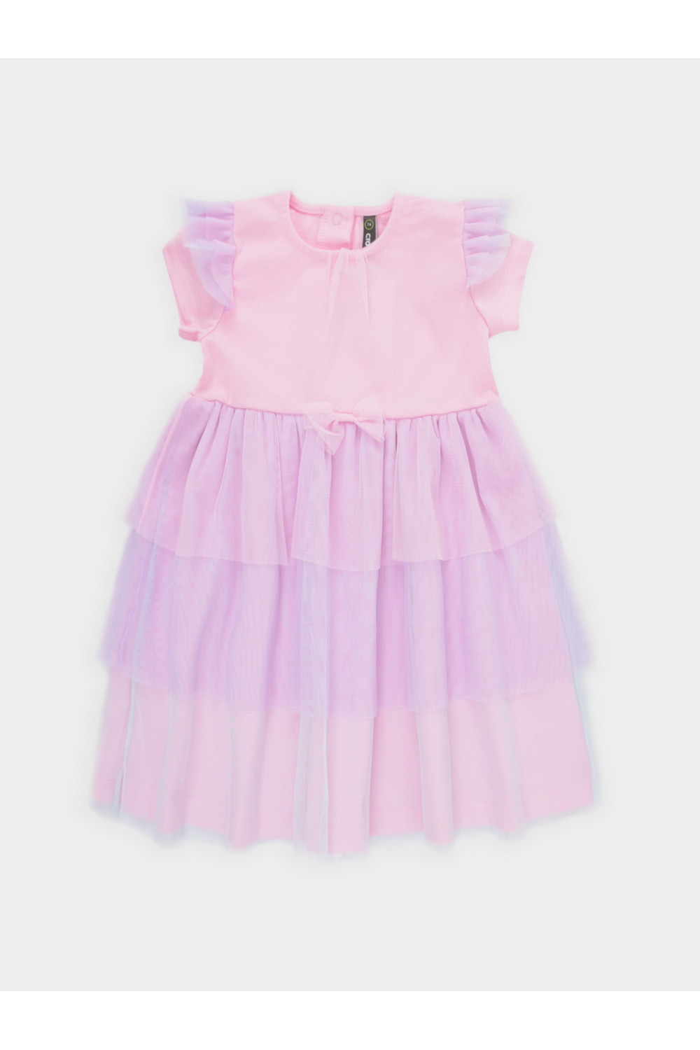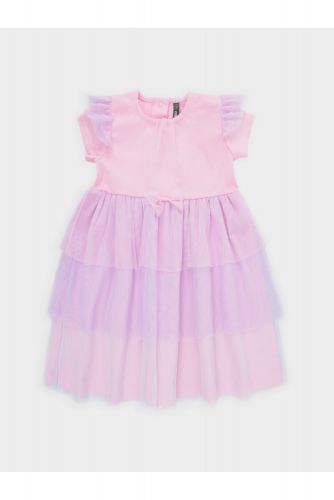 Нарядное платье с воздушными крылышками для девочки. Изготовлено из высококачественного хлопкового трикотажа супрем. Поверх трикотажа лёгкая сетка. Для удобства одевания на спинке расположена застёжка на кнопки. Спереди украшено декоративным бантиком. Изделие сохраняет цвет и форму после многократных стирок.