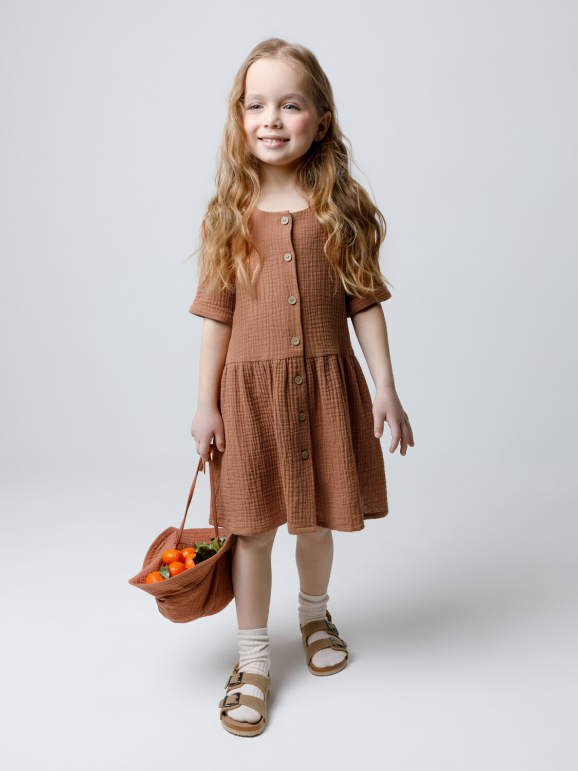 Легкое платье для девочки из мягкого хлопокового муслина со спущенной линией талии, сборкой и застежкой на пуговицы. Изделие сохраняет цвет, форму и фактуру жатости после многократных стирок.