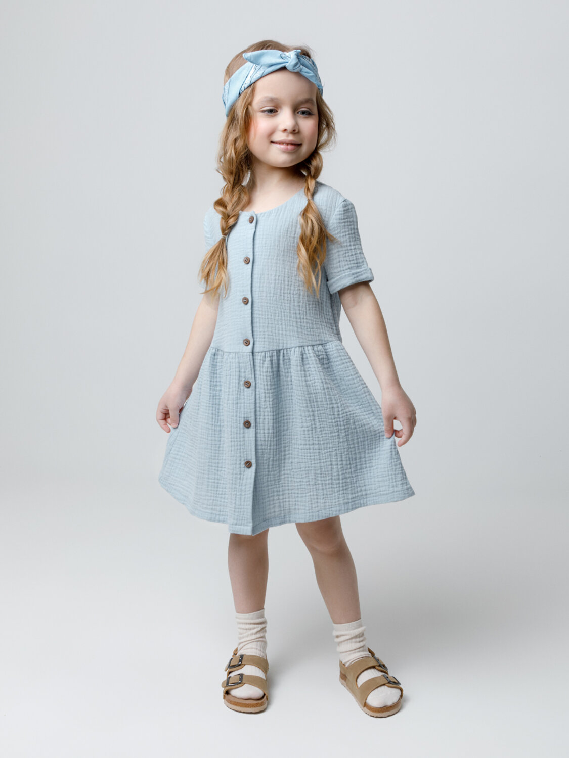 Легкое платье для девочки из мягкого хлопокового муслина со спущенной линией талии, сборкой и застежкой на пуговицы. Изделие сохраняет цвет, форму и фактуру жатости после многократных стирок.