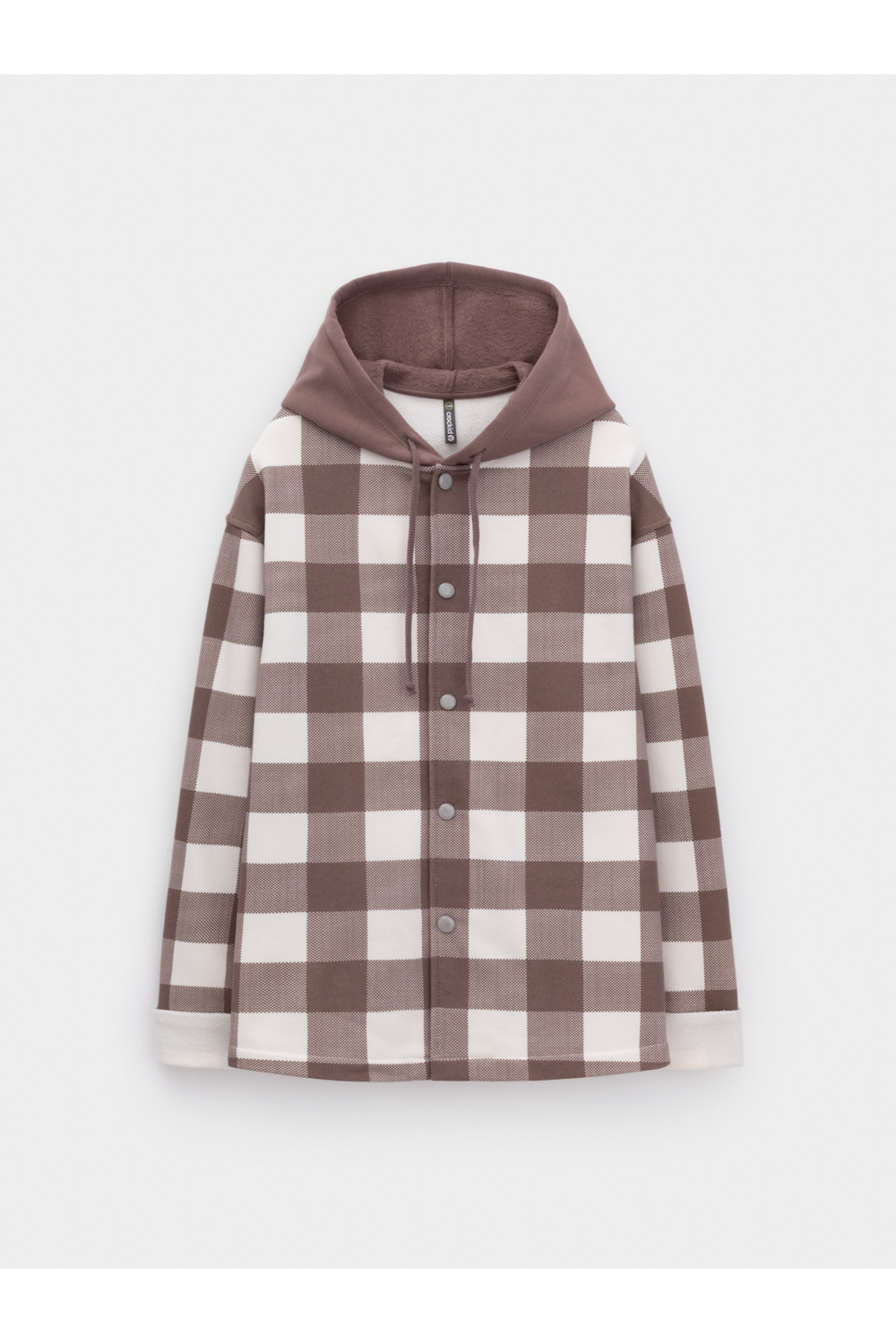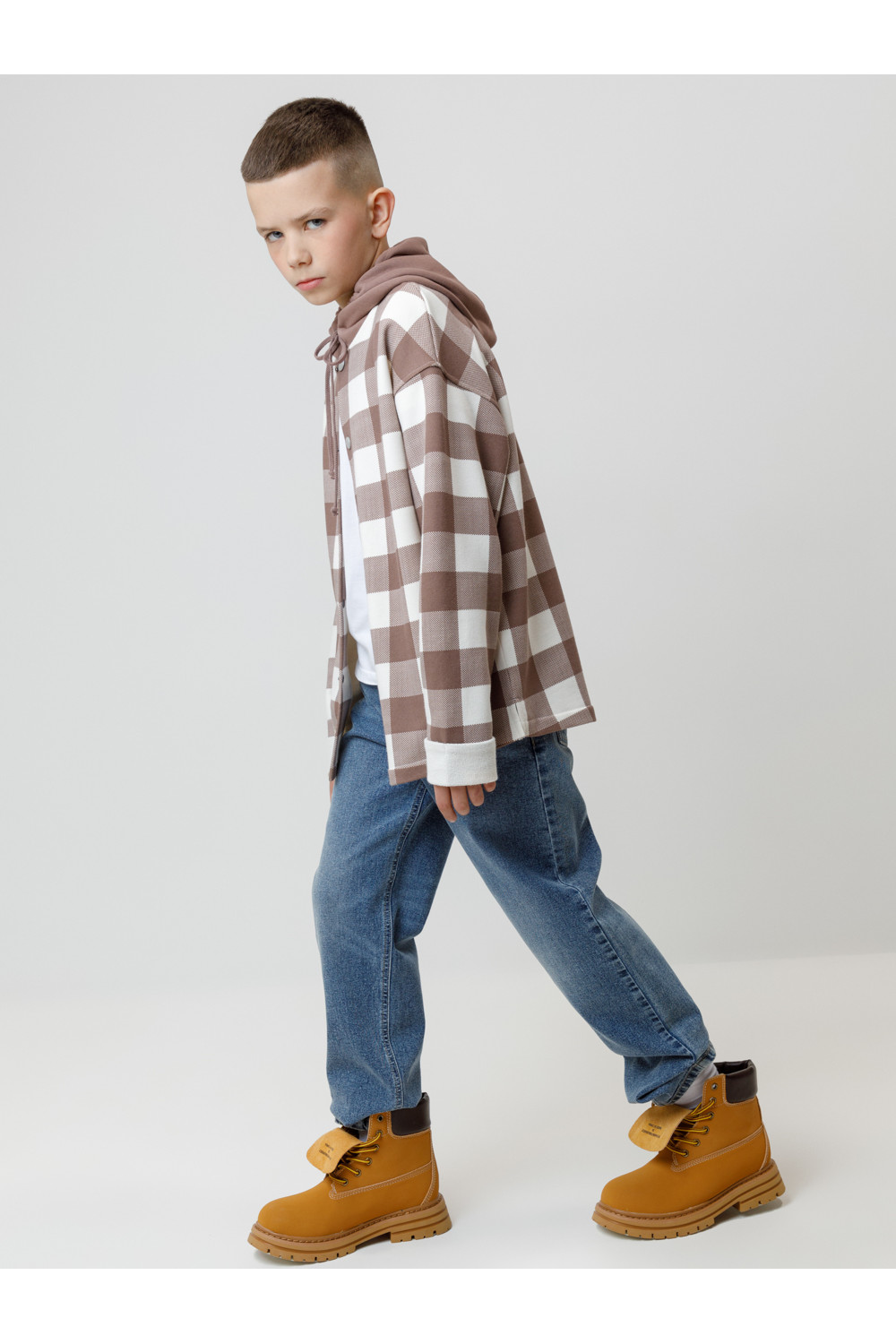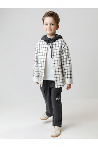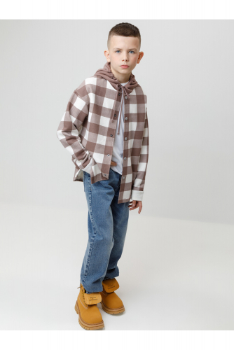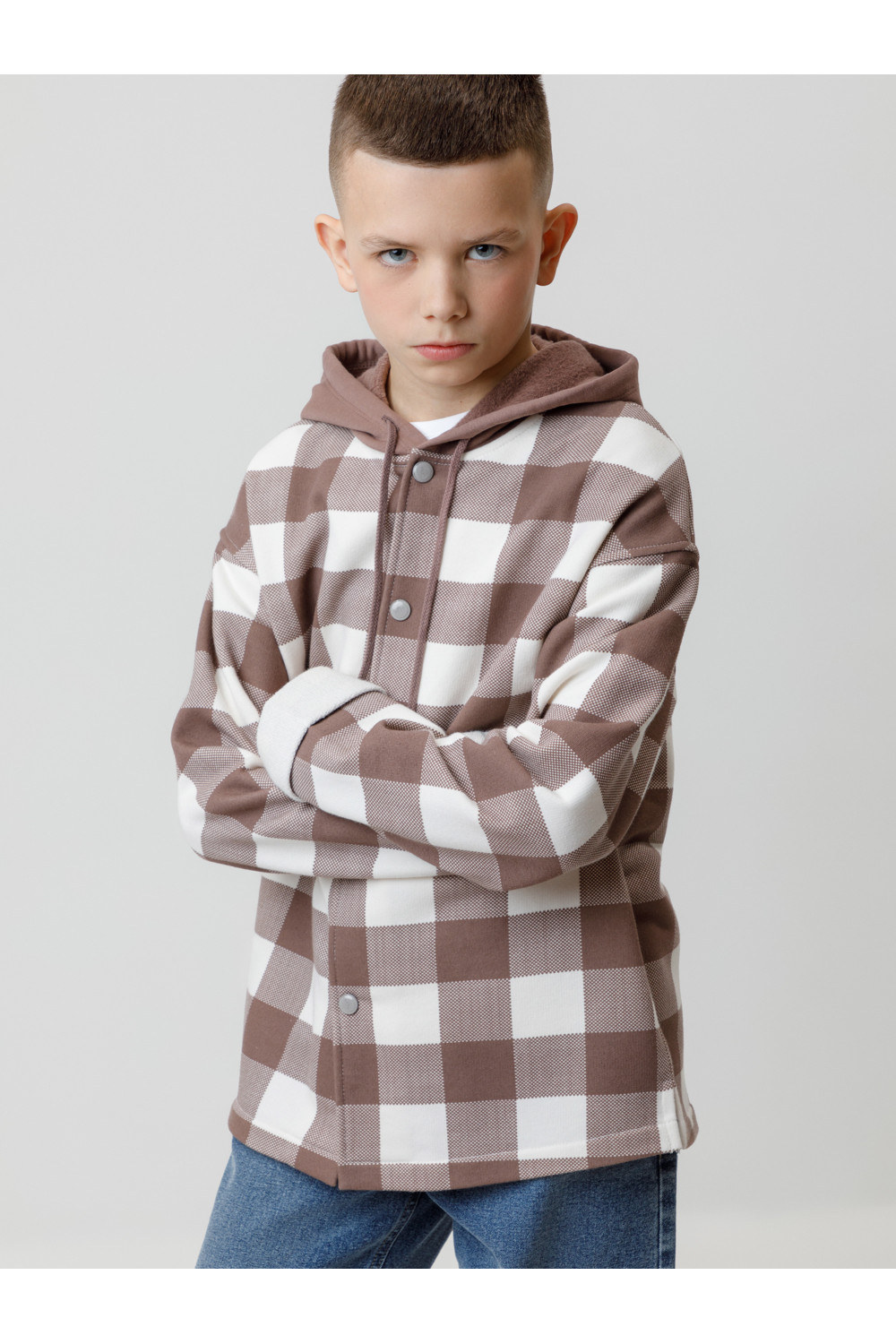 Свободная трикотажная рубашка для мальчика из мягкого петельчатого футера. В составе 80% натурального хлопка и 20% полиэстера, при этом полиэстер ввязан внутрь по особой технологии и не соприкасается с кожей. Застёгивается на кнопки. Модель с капюшоном и спущенным плечом. Рисунок в клетку выполнен из стойких текстильных гипоаллергенных красителей. Изделие сохраняет цвет и форму после многократных стирок. Все трикотажные полотна производятся в соответствии с нормами швейцарского сертификата ЭкоТекс.