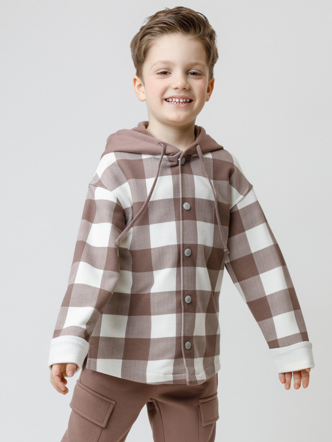 Свободная трикотажная рубашка для мальчика из мягкого петельчатого футера. В составе 80% натурального хлопка и 20% полиэстера, при этом полиэстер ввязан внутрь по особой технологии и не соприкасается с кожей. Застёгивается на кнопки. Модель с капюшоном и спущенным плечом. Рисунок в клетку выполнен из стойких текстильных гипоаллергенных красителей. Изделие сохраняет цвет и форму после многократных стирок. Все трикотажные полотна производятся в соответствии с нормами швейцарского сертификата ЭкоТекс.