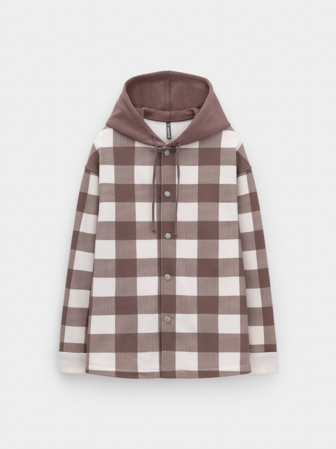 Свободная трикотажная рубашка для мальчика из мягкого петельчатого футера. В составе 80% натурального хлопка и 20% полиэстера, при этом полиэстер ввязан внутрь по особой технологии и не соприкасается с кожей. Застёгивается на кнопки. Модель с капюшоном и спущенным плечом. Рисунок в клетку выполнен из стойких текстильных гипоаллергенных красителей. Изделие сохраняет цвет и форму после многократных стирок. Все трикотажные полотна производятся в соответствии с нормами швейцарского сертификата ЭкоТекс.