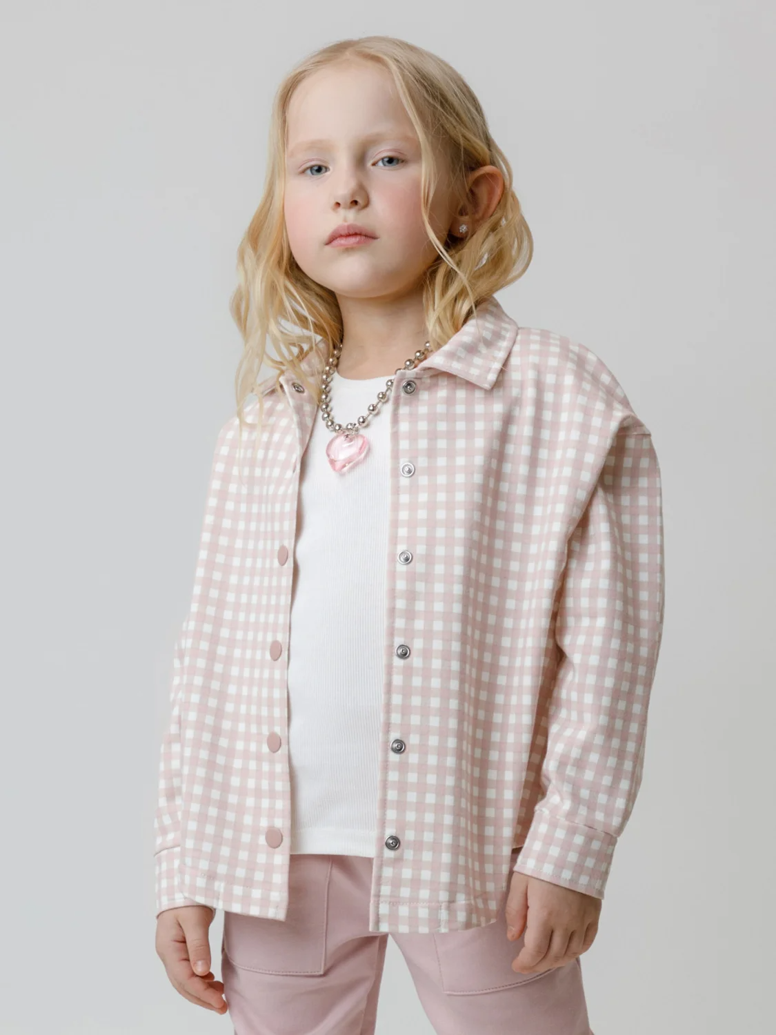 Свободная трикотажная рубашка для девочки из мягкого петельчатого футера. Застёгивается на кнопки. Модель с закругленным низом и спущенным плечом. Рисунок в клетку выполнен из стойких текстильных гипоаллергенных красителей. Изделие сохраняет цвет и форму после многократных стирок. Все трикотажные полотна производятся в соответствии с нормами швейцарского сертификата ЭкоТекс.