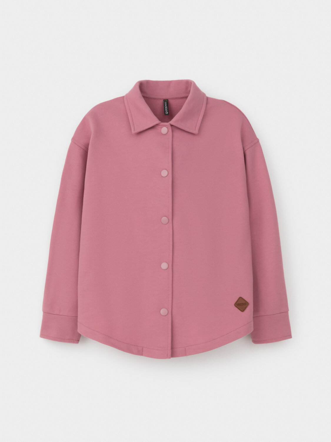 Свободная трикотажная рубашка для девочки из мягкого петельчатого футера. Застёгивается на кнопки. Модель с закругленным низом и спущенным плечом.