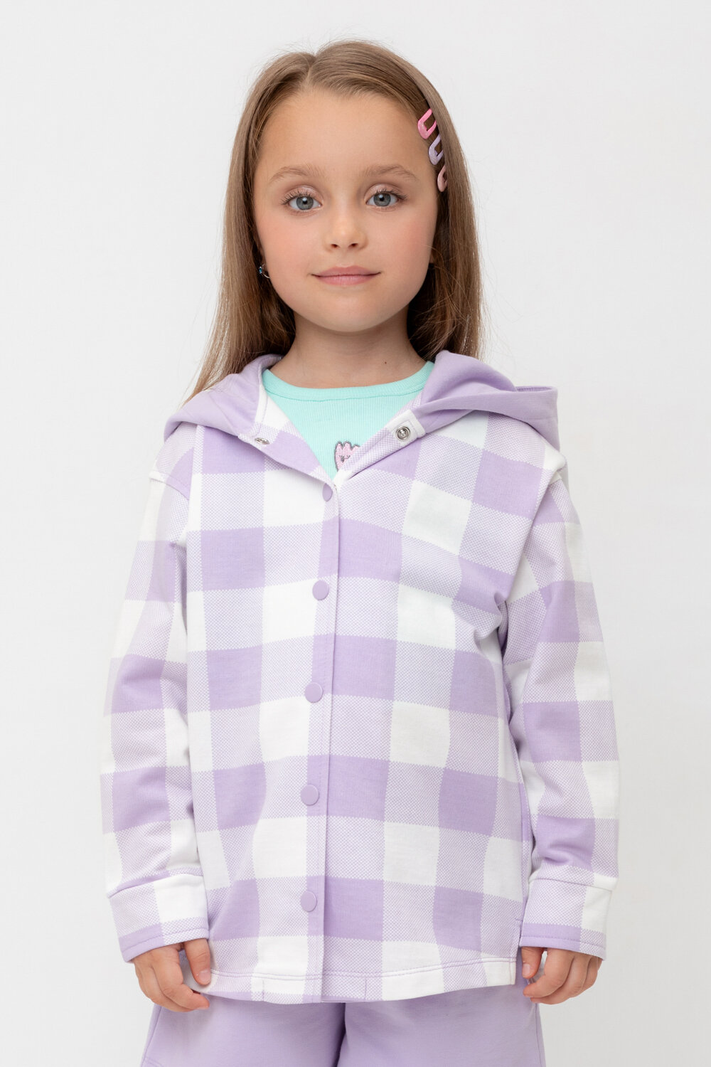 Свободная трикотажная рубашка для девочки с капюшоном. Выполнена из мягкого петельчатого футера. Застёгивается на кнопки. Модель с закругленным низом и спущенным плечом. По бокам разрезы.