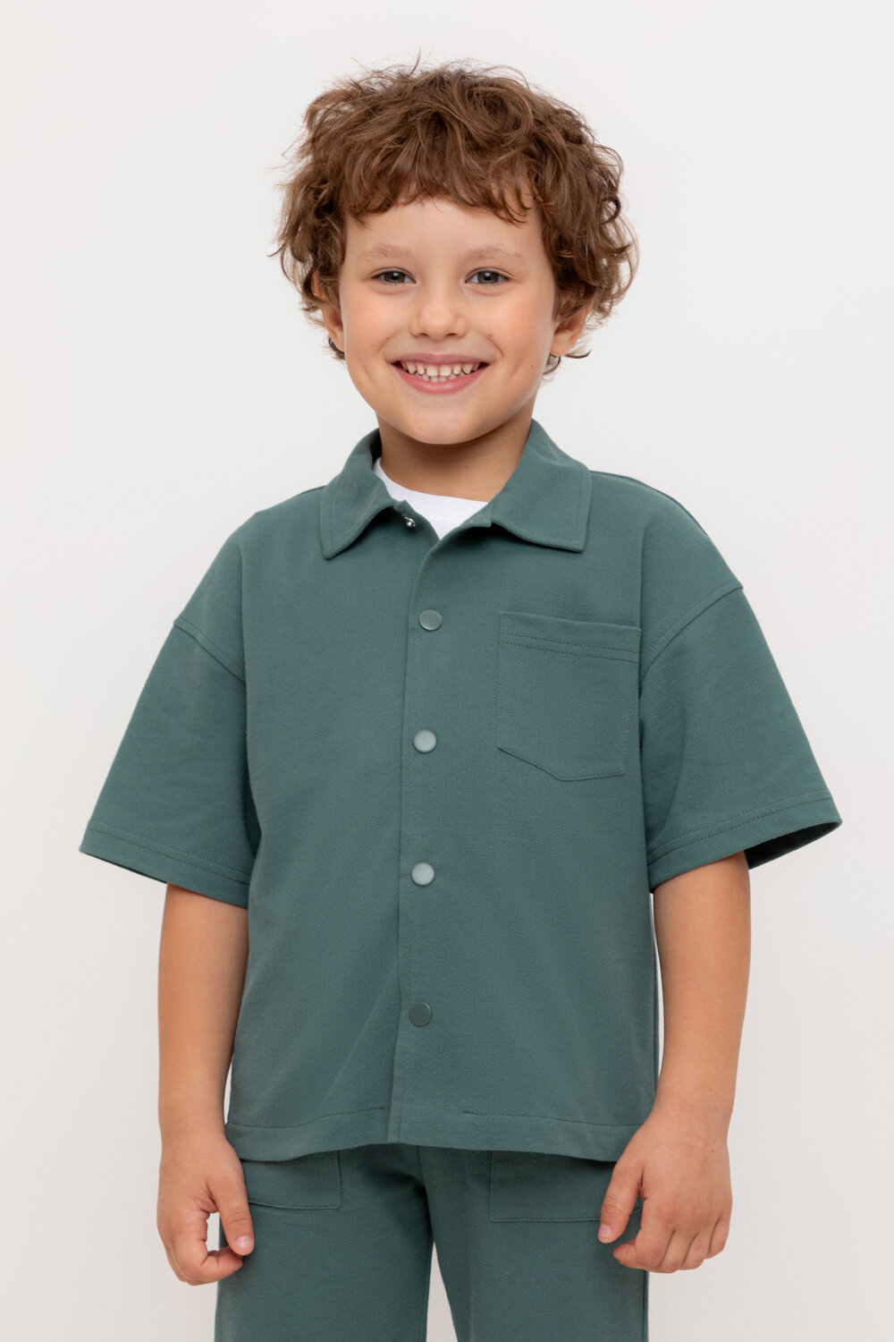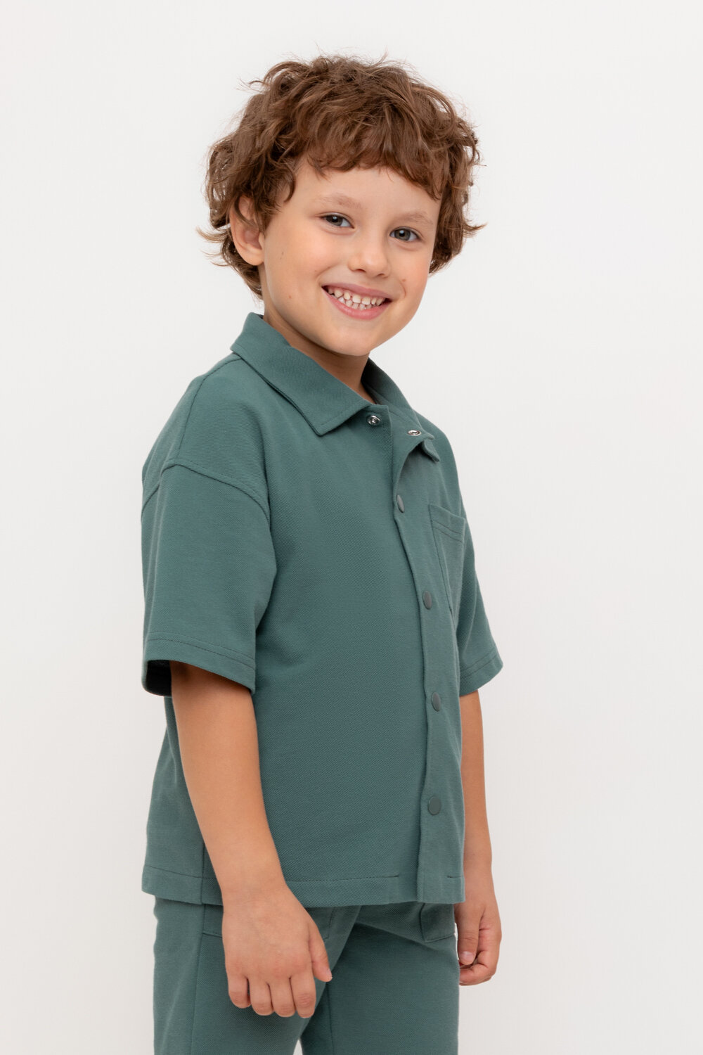 Рубашка для мальчика из мягкого высококачественного трикотажа пике. Застёгивается на кнопки. Модель со спущенным плечом.