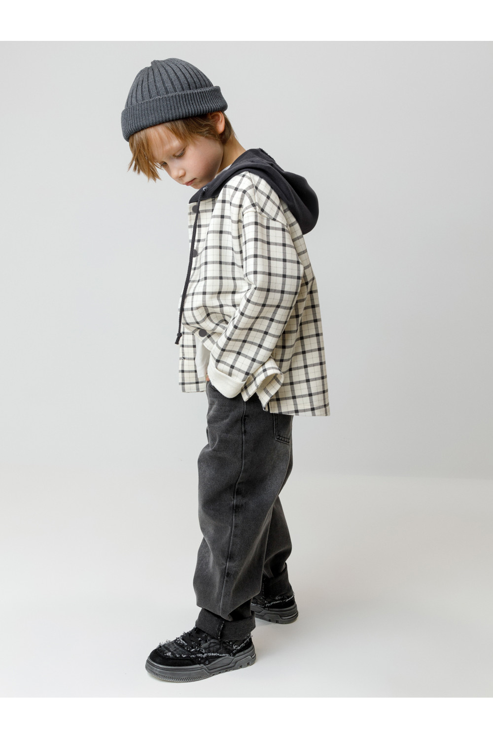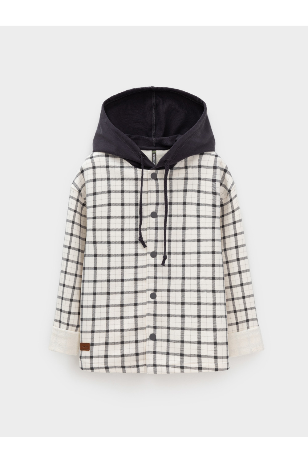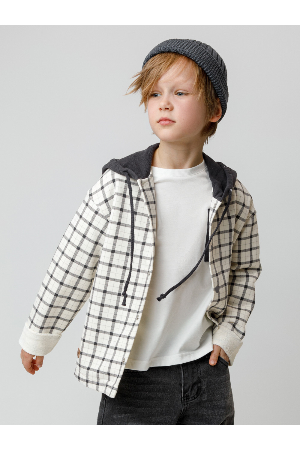 Свободная трикотажная рубашка для мальчика из мягкого петельчатого футера. В составе 80% натурального хлопка и 20% полиэстера, при этом полиэстер ввязан внутрь по особой технологии и не соприкасается с кожей. Застёгивается на кнопки. Модель с капюшоном и спущенным плечом. Рисунок в клетку выполнен из стойких текстильных гипоаллергенных красителей. Изделие сохраняет цвет и форму после многократных стирок. Все трикотажные полотна производятся в соответствии с нормами швейцарского сертификата ЭкоТекс.