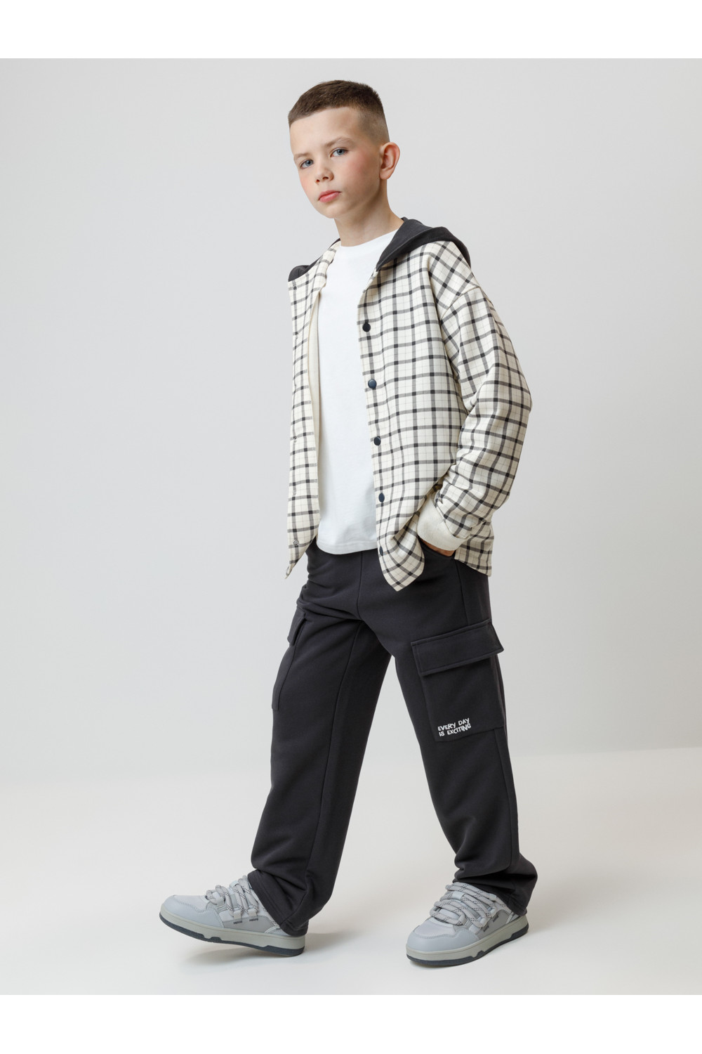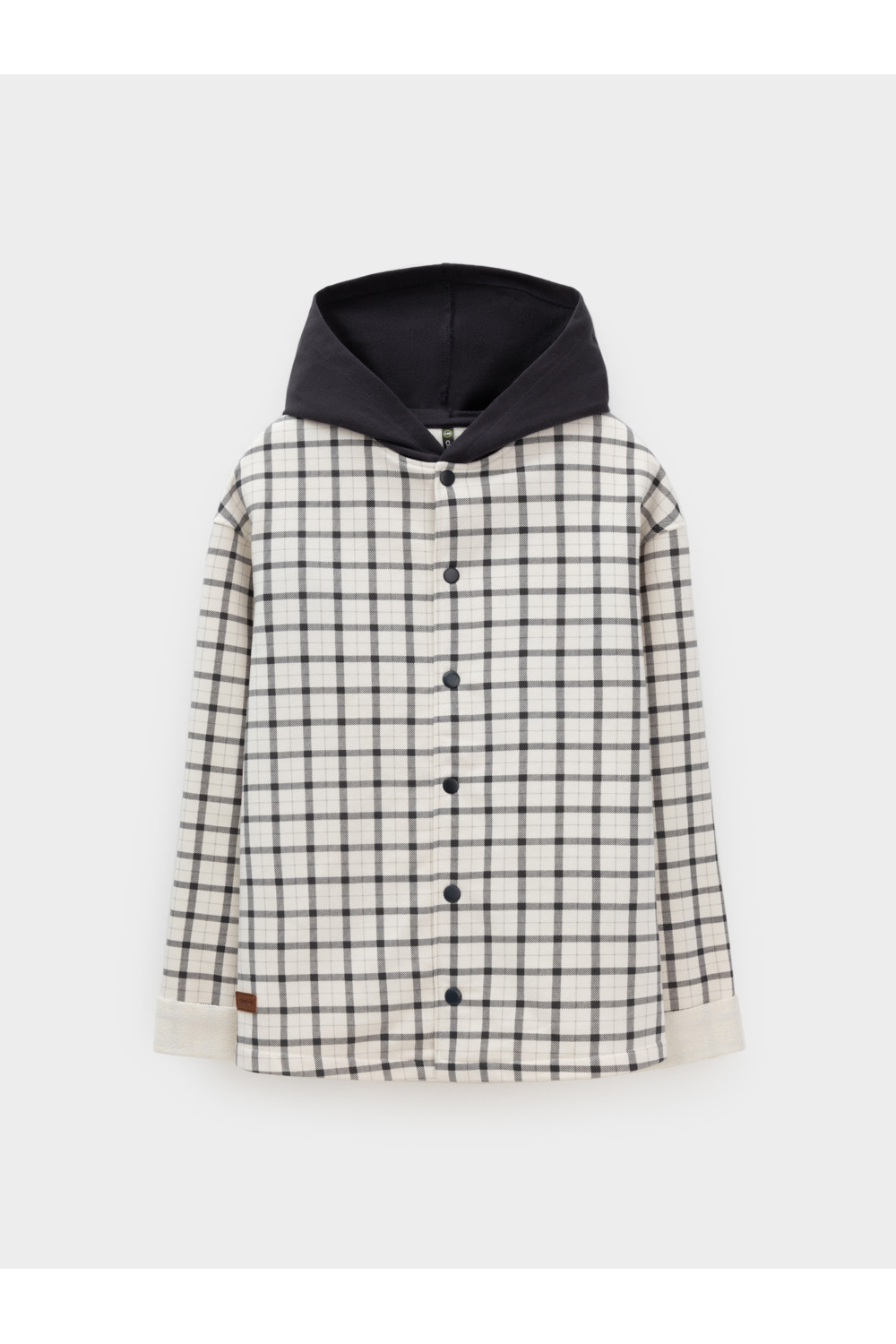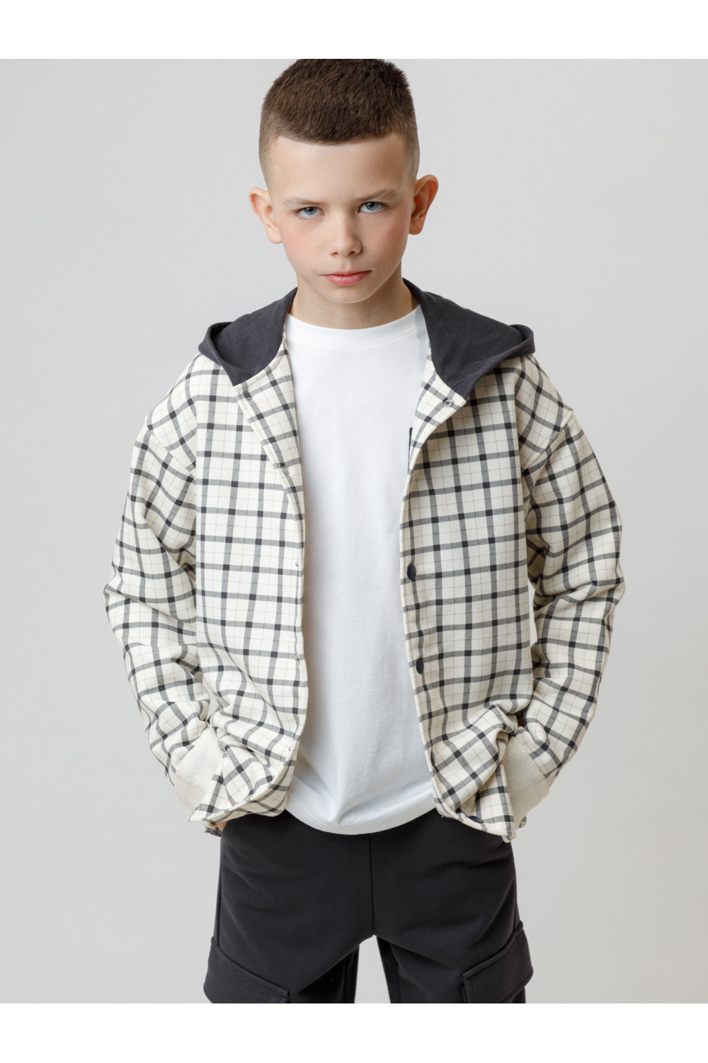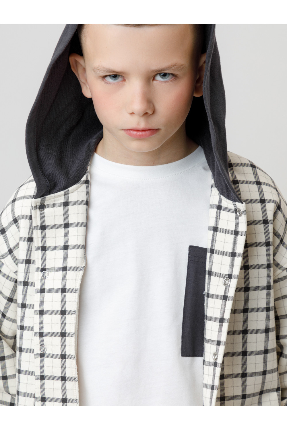 Свободная трикотажная рубашка для мальчика из мягкого петельчатого футера. В составе 80% натурального хлопка и 20% полиэстера, при этом полиэстер ввязан внутрь по особой технологии и не соприкасается с кожей. Застёгивается на кнопки. Модель с капюшоном и спущенным плечом. Рисунок в клетку выполнен из стойких текстильных гипоаллергенных красителей. Изделие сохраняет цвет и форму после многократных стирок. Все трикотажные полотна производятся в соответствии с нормами швейцарского сертификата ЭкоТекс.